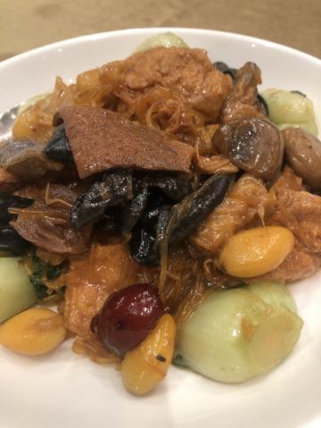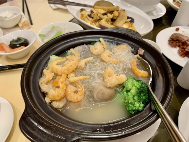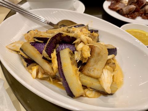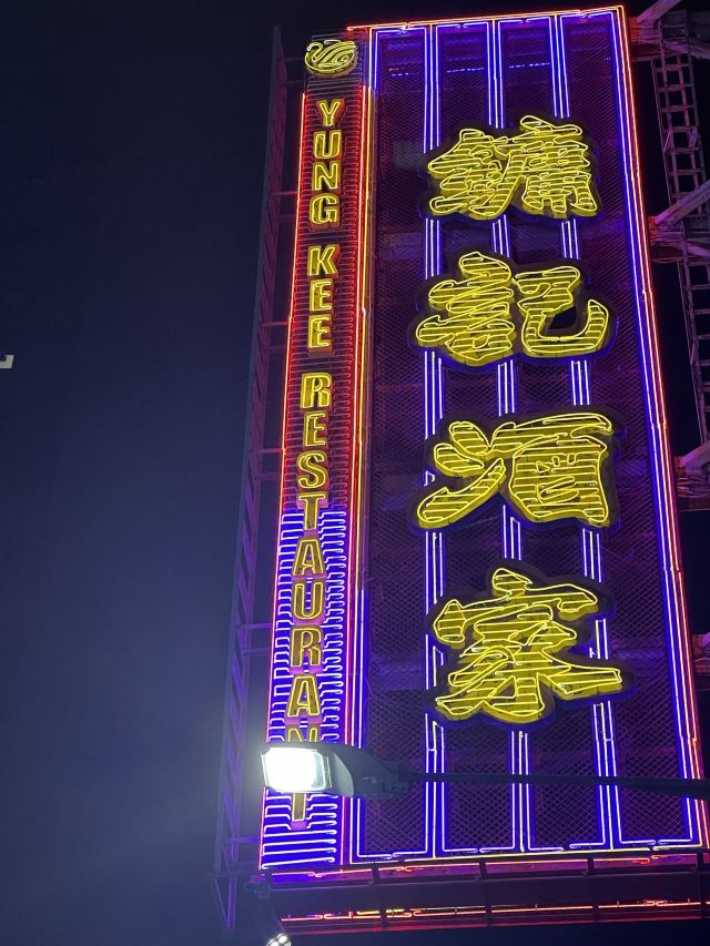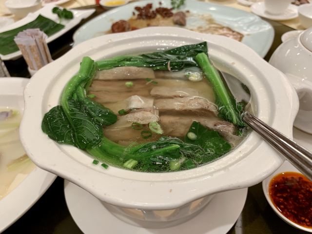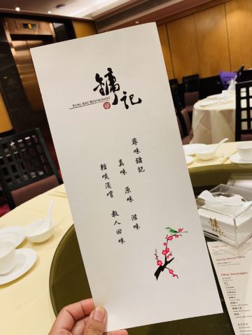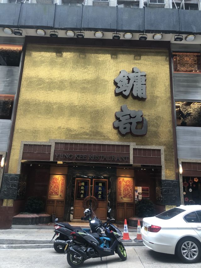 Yung Kee Restaurant在携程口碑榜亚洲100当地风味餐厅榜单上看到,加上uber司机作为当地人强烈推荐,决定来吃。位置在中环,旁边就是兰桂坊,如果住在中环基本上可以步行来吃或者吃完回酒店。餐厅以烧鹅闻名,明档有师傅在制作烧鹅,也表明了炭火烤制的特色做法。餐厅里有很多老照片记录着它的历史,不过服务对比其他老字号很现代化,因为菜单没有图,服务人员西装革履毫无感情快速推荐可能是中环特色。烧鹅可以自选胸部和腿部,上面的汤汁是上菜时服务员带着一壶当你面淋上去的,应该就是靠这个老汤的配方。因为特色是烧鹅,鹅的周边也是特色,鹅肝肠和猪肉腊肠的双拼还有外卖款。还点了皮蛋和虾籽扎蹄(像是虾籽豆腐卷,熏制的),龟苓膏和布丁。总体来说餐厅可以自己探索的很多,味道的话适合日常喜欢吃禽类的朋友。