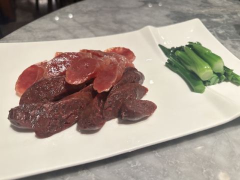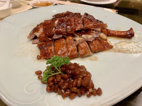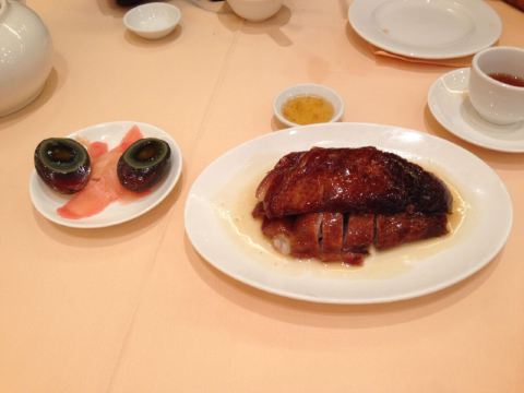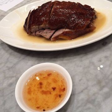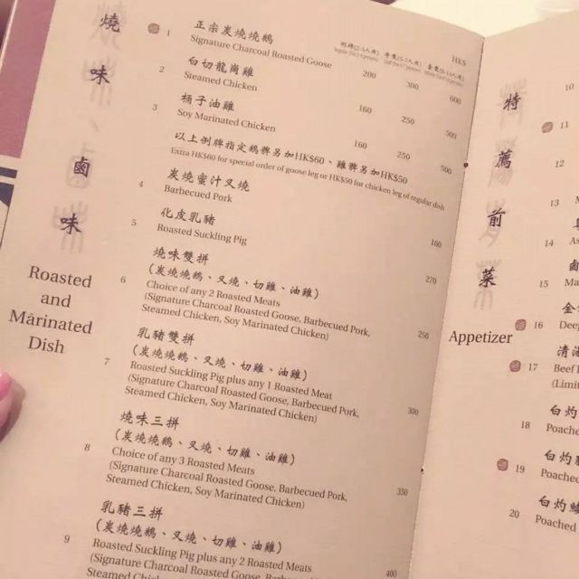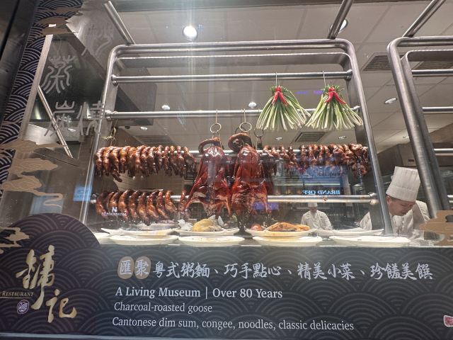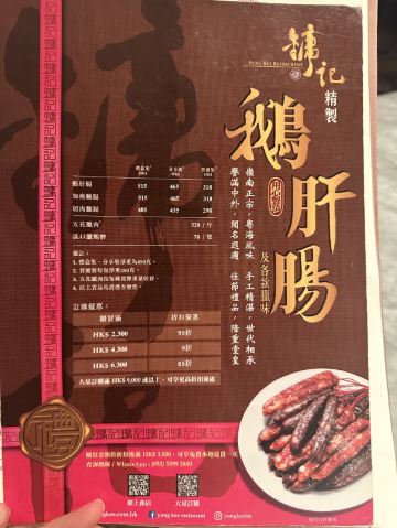 天旭在携程口碑榜亚洲100当地风味餐厅榜单上看到,加上uber司机作为当地人强烈推荐,决定来吃。位置在中环,旁边就是兰桂坊,如果住在中环基本上可以步行来吃或者吃完回酒店。餐厅以烧鹅闻名,明档有师傅在制作烧鹅,也表明了炭火烤制的特色做法。餐厅里有很多老照片记录着它的历史,不过服务对比其他老字号很现代化,因为菜单没有图,服务人员西装革履毫无感情快速推荐可能是中环特色。烧鹅可以自选胸部和腿部,上面的汤汁是上菜时服务员带着一壶当你面淋上去的,应该就是靠这个老汤的配方。因为特色是烧鹅,鹅的周边也是特色,鹅肝肠和猪肉腊肠的双拼还有外卖款。还点了皮蛋和虾籽扎蹄(像是虾籽豆腐卷,熏制的),龟苓膏和布丁。总体来说餐厅可以自己探索的很多,味道的话适合日常喜欢吃禽类的朋友。