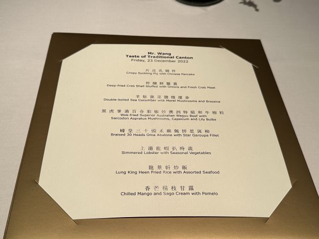 龙太子蒸饺,瑶柱小笼包,片皮乳猪片,龙虾鸡茸粟米羹,酸甜咕噜肉,原只鲍鱼鸡粒酥,燕窝杨枝甘露,龙景轩炒饭,椒盐田鸡腿,豉油皇煎东星斑柳,奶凰酥,皇汤鸡丝羹,黑蒜虾球,炸酿鲜蟹盖,琵琶映窗纱,红烧澳洲和牛面肉,杨枝甘露,蜜汁叉烧,龙带玉梨香,松子叉烧菠萝包,鲍鱼鸡粒酥,奶黄水晶花,云腿菜胆炖辽参,枸杞桂花糕配芝麻脆饼