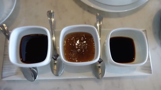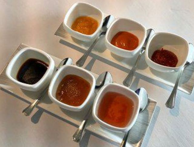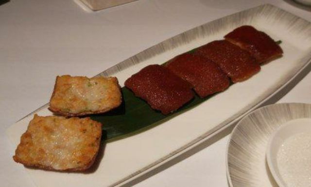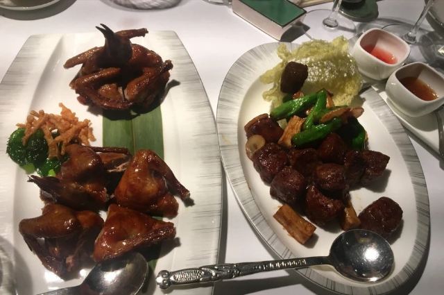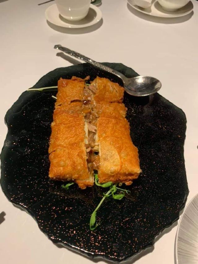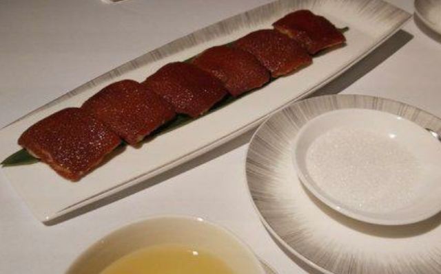 杨枝甘露,龙皇炒鲜奶,青椒和牛,豉汁芦笋明虾球,脆酿鲜蟹盖,香烤片皮鸭,乳猪,花胶辽参汤,龙带玉梨香,三味海鲜饺,烧味
