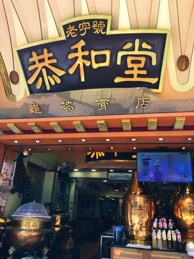 恭和堂,香港最老字号的凉茶铺,当家产品是龟苓膏。店中左右各有大铜炉,墙上则“爬”着炼药用的乌龟。清热解毒,醇厚甘苦。目前龟苓膏买8送1。