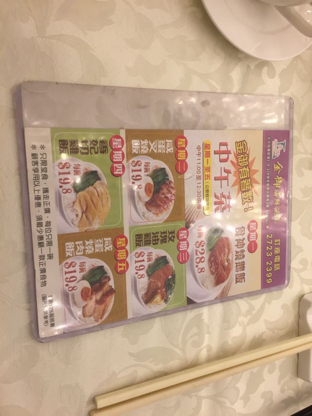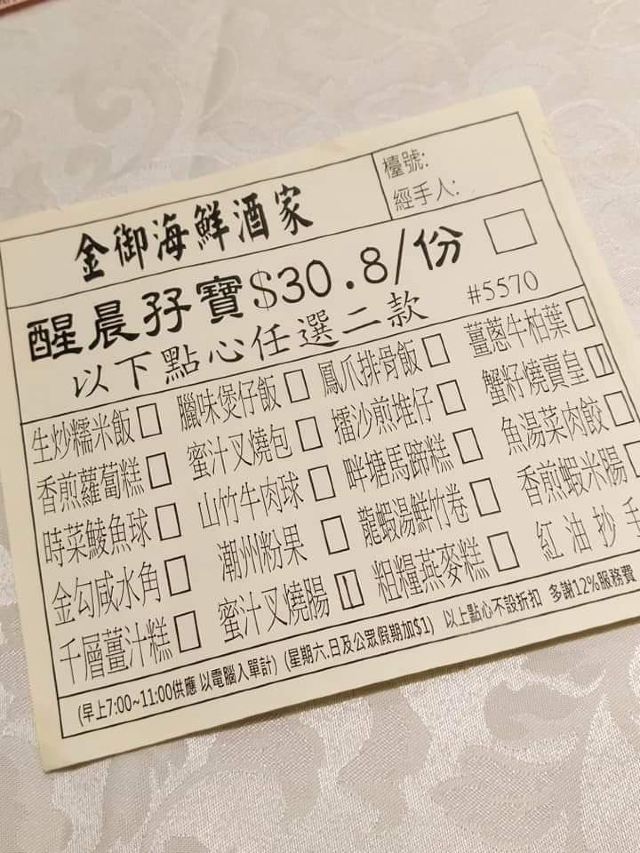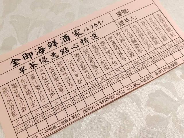 金御鲜虾饺,凤爪,鲜虾烧卖皇,流沙包,煎饺,叉烧肠粉,牛肉滑蛋粥,虾肉烧卖,芝麻脆蛋散,杨枝甘露