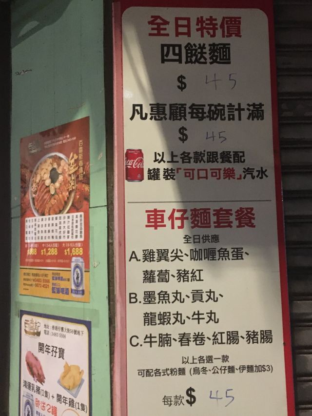 清清楚楚的“辉记车仔面”,位于鸭脷洲大街上。新年的气氛笼罩,前后左右不少餐厅都用红包贴出自己的年后启市时间,可是辉记车仔面没有。显示于外的,只有菜单和菜价。