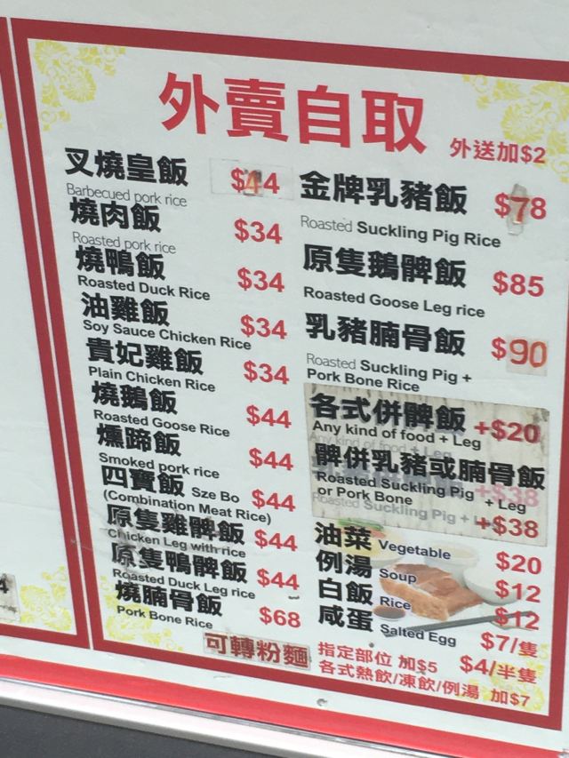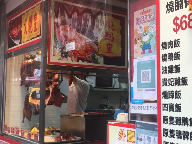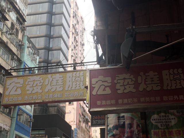 在通菜街上,宏发烧腊的招牌伸得很高很远。似乎叉烧皇是这里的当家菜,名字挂得最显眼,价格也比烧肉、烧鸭、油鸡更贵。欢迎外卖自取,如果外送只需加2元。