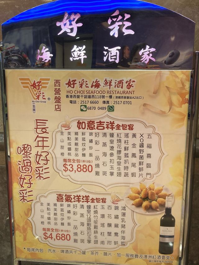 西营盘地铁站A2出口的马路对面,有“好彩酒家”的大招牌。这个名字是简写,走进干诺道西118号商场一楼,看见全称“好彩海鲜酒家”。正在推广“如意吉祥全包宴”。