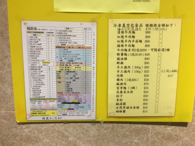 红烧半筋半肉牛肉面,红烧三宝面,牛肉麵,肉燥便当,豬手麵,万峦猪脚,半筋半肉牛肉麵,笋丝卤,玉米起司蛋饼,嫩仙草芋圆,大肠圈,麻油鸡面线,虎咬猪,红烧半筋半肉牛肉麵,蚵仔煎,肉燥便當,程班長便當,清燉半筋半肉麵,凤梨冰芋圆,甜不辣,紅燒三寶麵,萬巒豬腳,肉燥干伴面,山粉圓