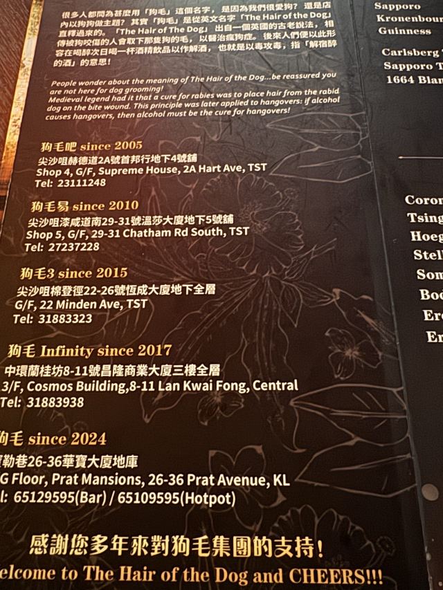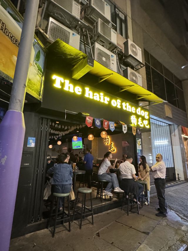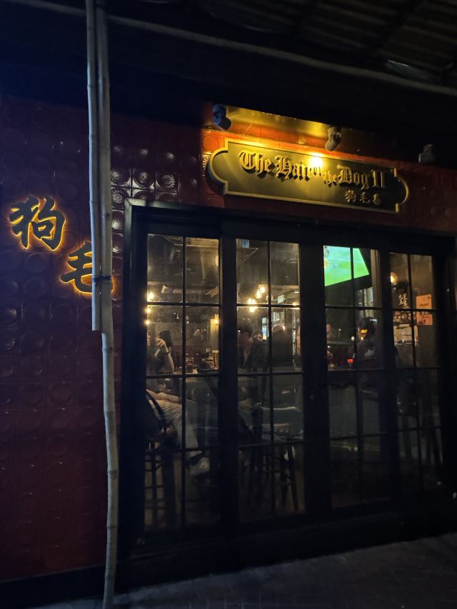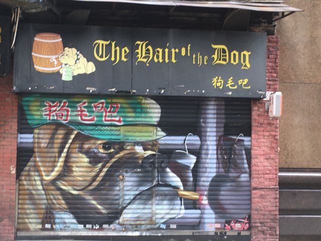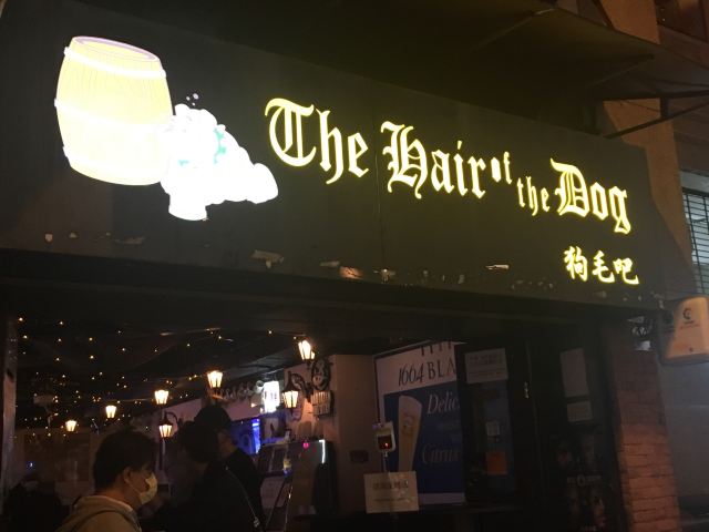 “狗毛”这个名字在尖沙咀的酒吧频繁出现:棉登径有个“狗毛3”、漆咸道有个“狗毛易”,而赫德道这个似乎是最正宗的“狗毛”。狗毛吧2005年开业、狗毛易2010年,狗毛3则直至2015年才问世。“狗毛”这个名字源自英语“hair of the dog”。在英国的古老传说中,被狗咬伤后可取下咬人的狗的毛发,用于医治狂犬病。后来推广到宿醉者次日再喝酒以求解酒,以毒攻毒。