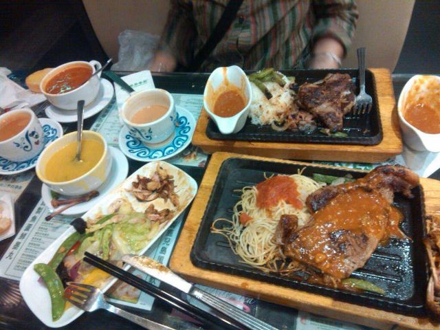到达酒店安顿好已经是晚上七点多了,饥肠辘辘之际看到酒店对面就是大名鼎鼎的翠华餐厅,当然不可错过了。这里招牌的海南鸡饭上次来试过了,这次决定吃别的。点了铁板大虾鸡扒饭,除了套餐配的咖啡外,晚餐时分还配周打鱼汤和面包,,,