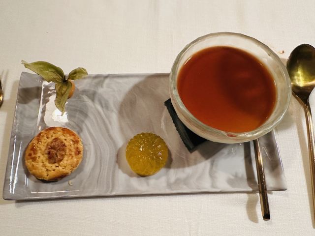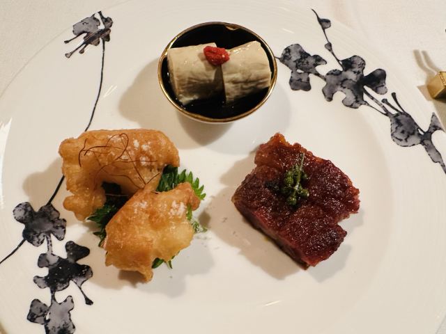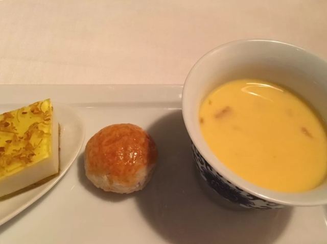 蜜汁叉烧,枫叶柑橘酥,朱古力牛油果西米露,富贵盐香鸡,芥末香煎澳洲M9和牛粒,鲍鱼鸡粒酥,虾饺,黑豚肉叉烧,杨枝甘露,东星斑,松茸汤,云腿班片蒸豆腐,三色肠粉,流心烧卖,鱼籽鹌鹑蛋烧卖,燕窝杨枝甘露,烧味