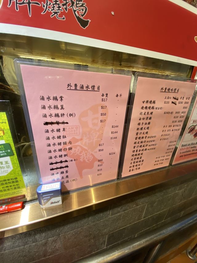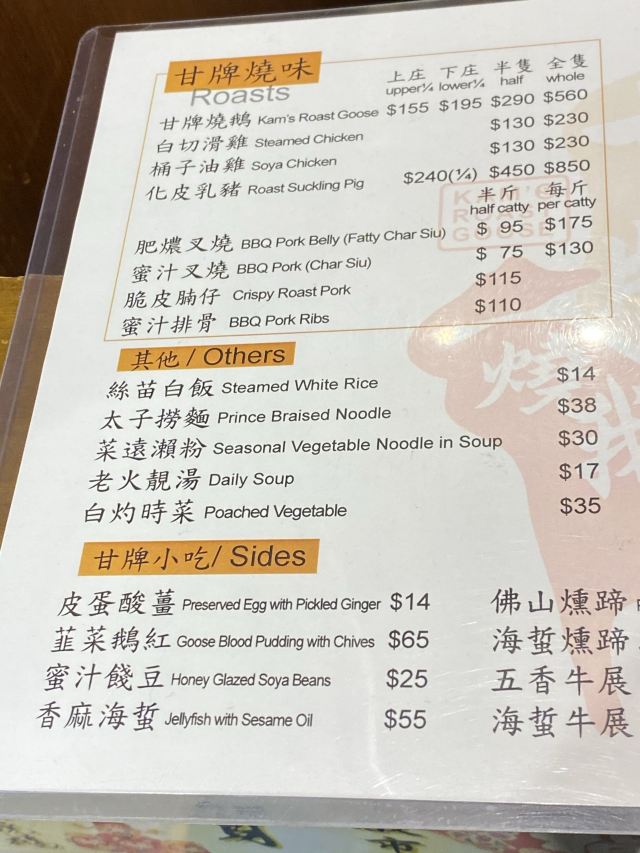 甘牌烧鹅,热柠茶,冻柠檬可乐,烧乳猪,蜜汁叉烧,烧鹅叉烧双拼,韭花鹅红,皮蛋酸姜,白灼菜心,太子捞面,卤水花菇,烧鹅拼叉烧饭