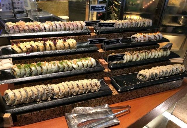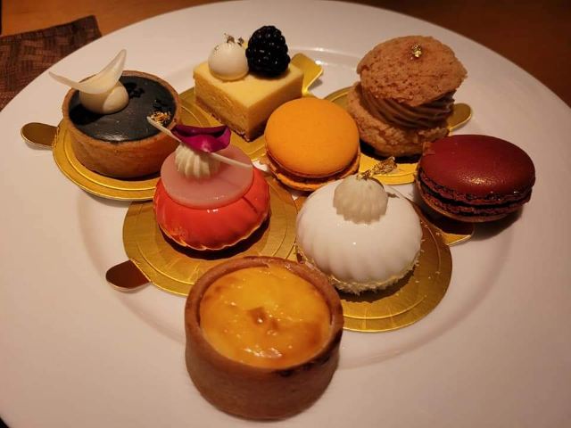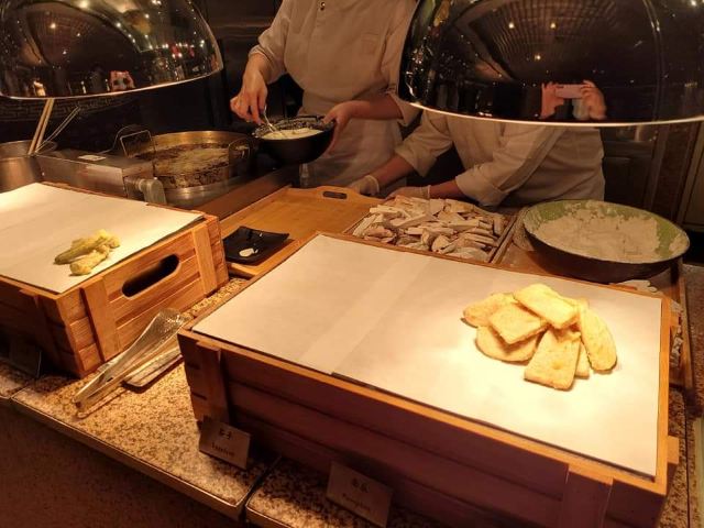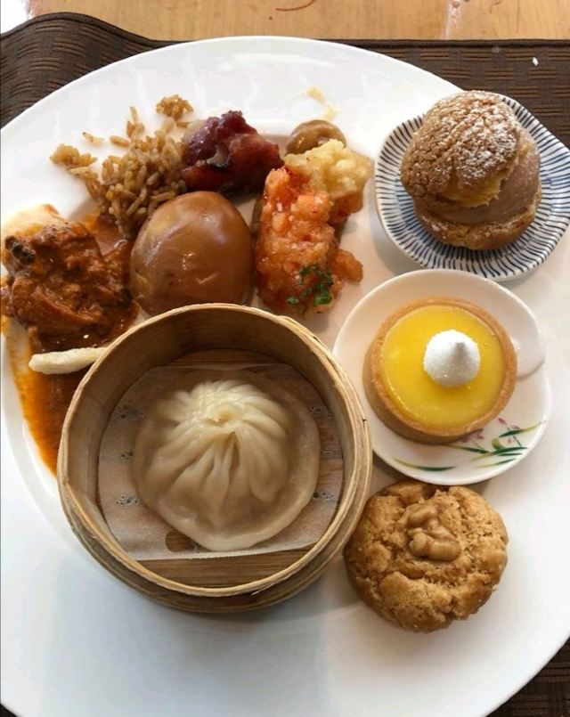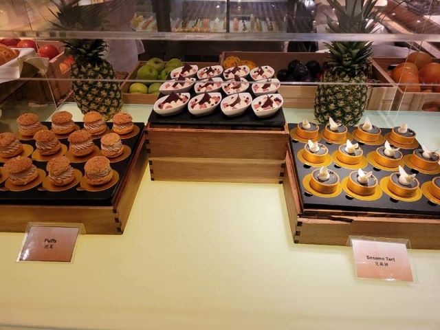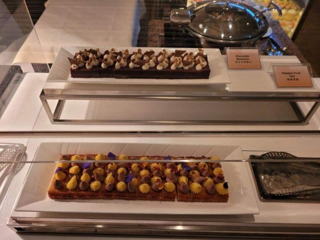 素食选择还算多。沙律、炸物天妇罗、蛋糕、雪糕则有很多款,炖糖水也有一款。 沙律吧有:红菜头烤南瓜、杂菜大黎麦、大啡菇、新鲜沙律菜、车厘茄熟食选择也不少,有炸物天妇罗、双花炒杂菜菇菌、四季豆炒百合木耳(有蒜茸)、咖哩杂豆、印度薄饼、灼菜。 甜品有:芝士挞、杂锦马卡龙、朱古力布朗尼、泡芙、面包布甸、班戟、多款蛋糕、8款哈根达斯雪糕。值得一提的是蛋糕和泡芙做得很精致吸引,最吸睛的地方是大部分蛋糕上面有一片薄薄的金箔。每件小小的,令人忍不住吃上几件也不觉得腻