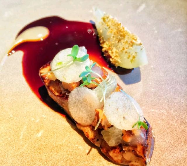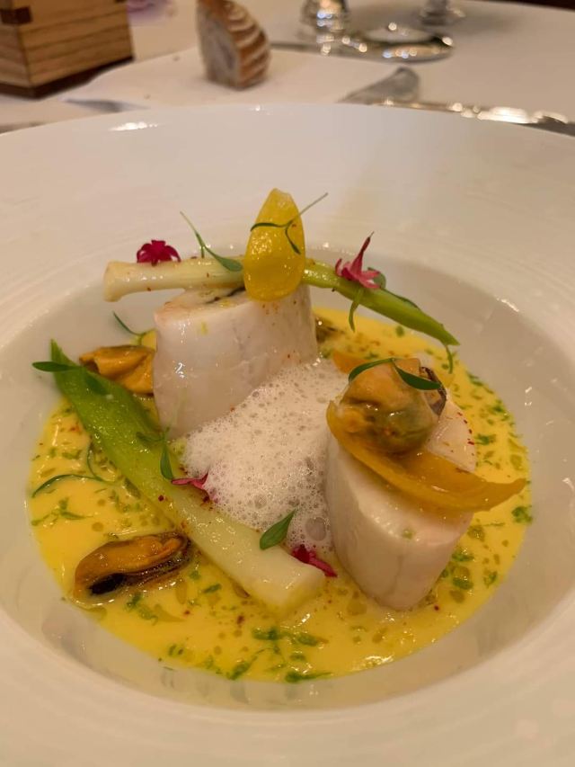 龙虾沙拉,银鳕鱼,鹅肝,黑蒜烤生蚝,海鲜酥皮配龙虾汁,蘑菇汤,甜品,软餐包,巧克力,云呢拿马卡龙,法式鱼汤,慢煮鲂鱼配盐角草醋汁,烟三文鱼果冻,黑松露吐司