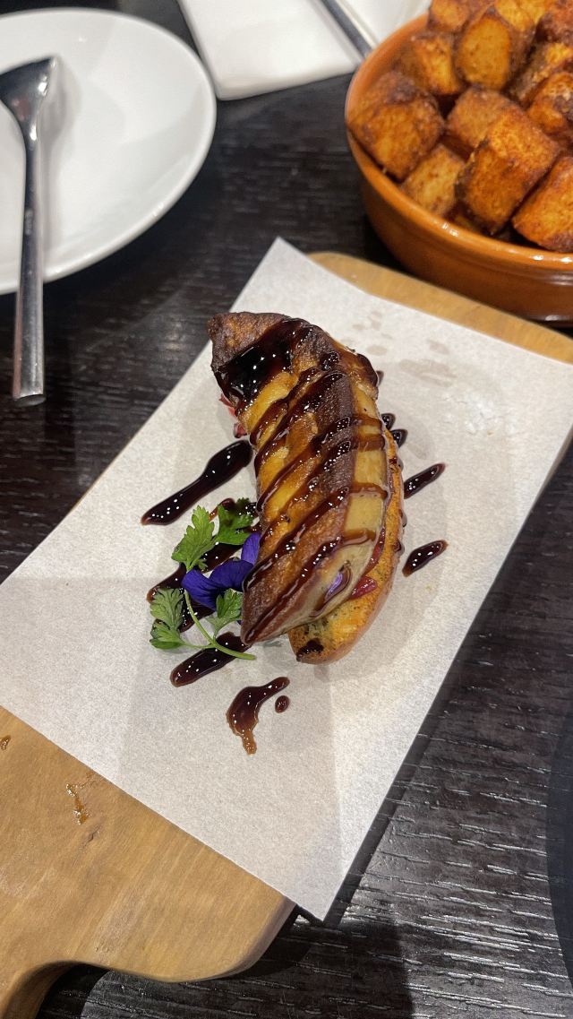 Can耶澳门美食🇲🇴浪漫街头感的西班牙餐厅|鹅肝超赞🇪🇸欧陆美食📍澳门路氹连贯公路新濠天地新濠天地二楼今日之行在新濠天地于是我们就二楼苏濠里安排安排了晚餐这家餐厅宛若外国浪漫街头🕰在这里可以品尝到各种西班牙风味小食🇪🇸❤推荐个人比较喜欢的几个菜式🔘煎鴨肝法包这家的法包搭了厚厚一层鹅肝‼️是我目前吃过分量最厚实!味道也是最棒的😋一定要趁热吃,又嫩又香,好满足🤩🔘40個月黑毛豬火腿片黑毛猪🥓肉质和口感都蛮好的,切片薄嫩,不妨搭配蜂蜜酱面包片一起吃👍🏻🔘燒鷄扒外香里嫩,🍖表皮微微焦吃起来很香,挤上点柠檬汁风味更清新🍋🔘迷你和牛鴨肝酱芝士漢堡包很喜欢这种迷你size的🍔,几口一个刚刚好👌🏻和牛肉很美味,抹上鸭肝酱与芝士后一绝✨🔘西班牙黑毛豬飯超大一盘黑米饭,🍚口感软糯饱满~黑毛猪肉条微微煎过,入味分量多🍛🔘脆火腿波菜沙律菠菜沙律还是头一回吃,用的是菠菜的嫩叶部分~🥗微微甜,清新饭后菜〰️🍹西班牙水果酒清新的水果香🍓,颜值在线,度数也不算高,女孩子们可以安排哟~
