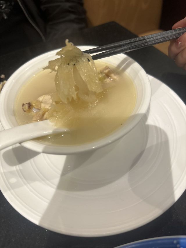 两个女生搞了个鱼翅花胶鸡套餐,很努力了还是有些吃不完,量挺大的。真的是真材实料,所以食材给了满分的,加了这么多料,汤头自然是越煮越浓郁,喝起来浓浓胶质感