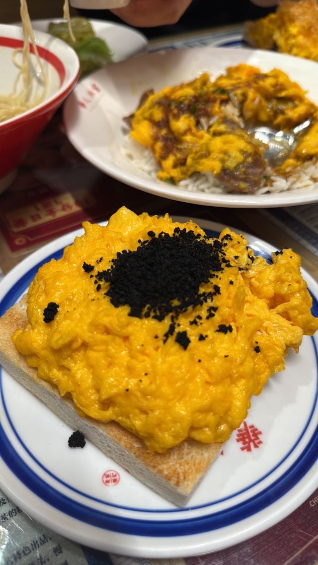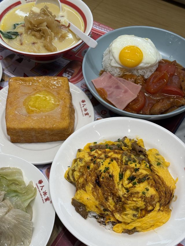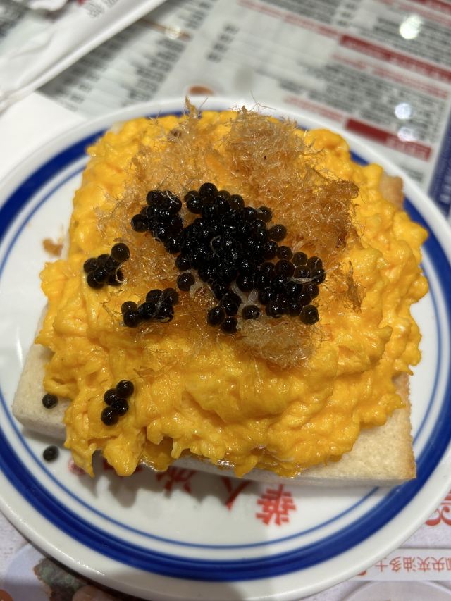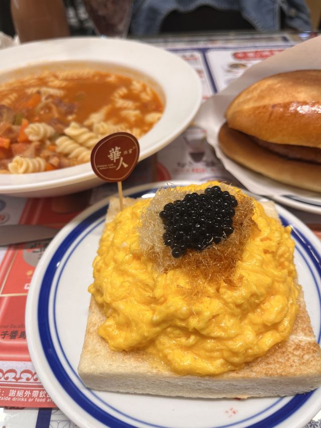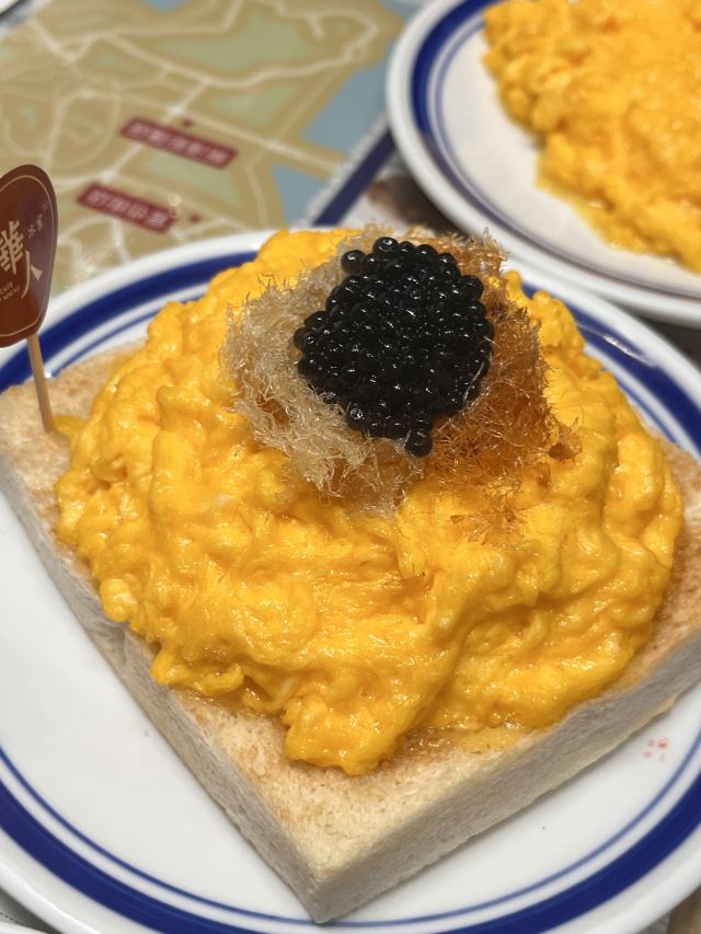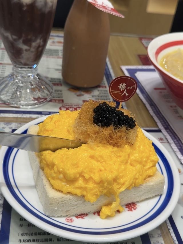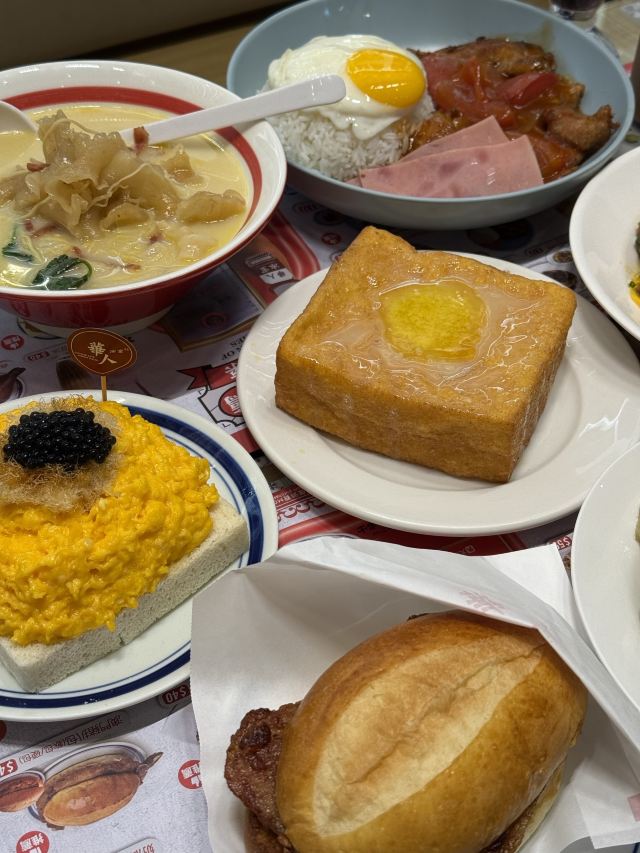 华人樽仔奶茶,黑松露炒蛋多士,滑牛饭,微辣沙一丁,鱼子酱马介休炒蛋多士 ,澳门猪扒包,鱼翅花胶汤面