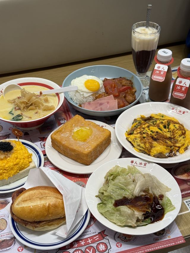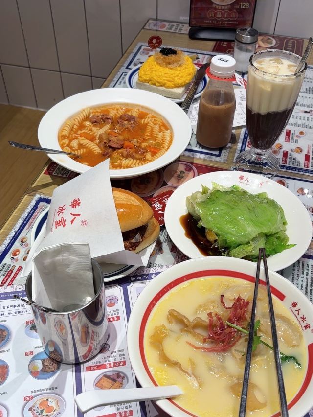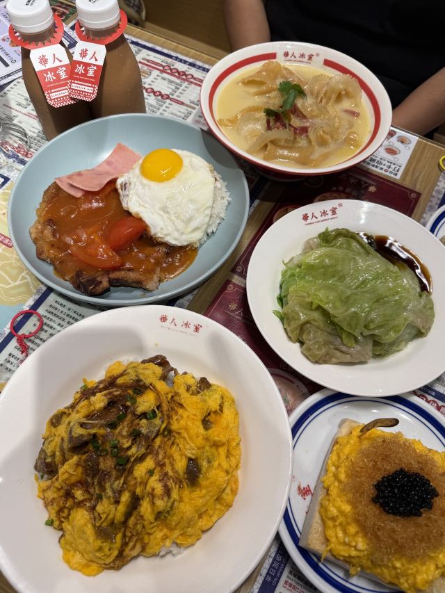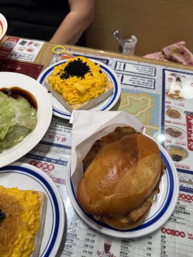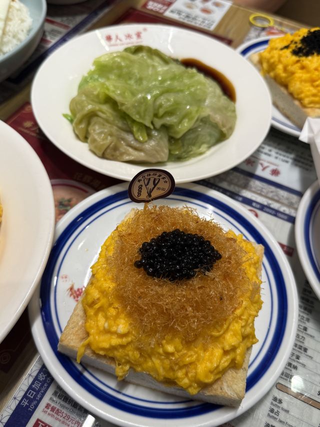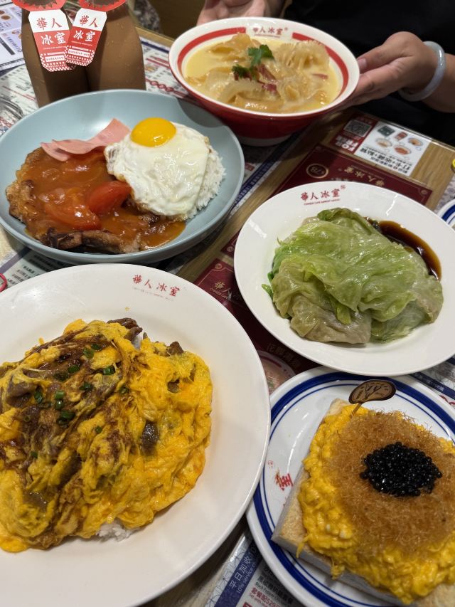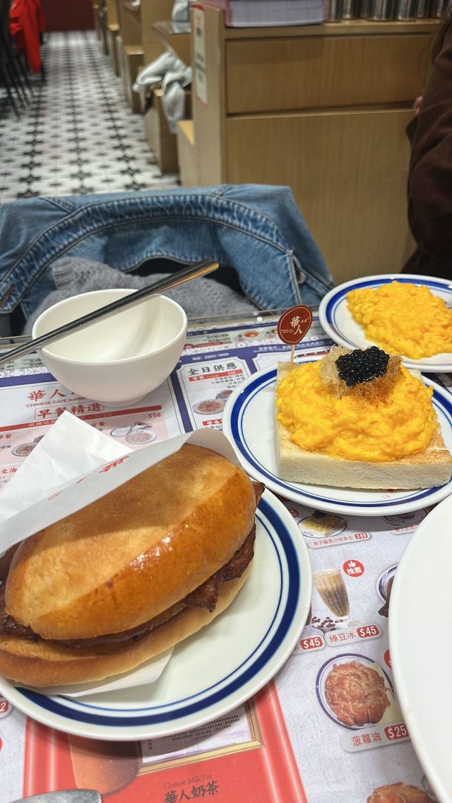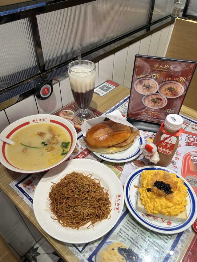 华人樽仔奶茶,黑松露炒蛋多士,滑牛饭,微辣沙一丁,鱼子酱马介休炒蛋多士 ,澳门猪扒包,鱼翅花胶汤面