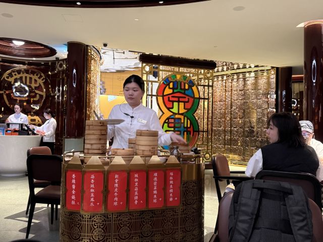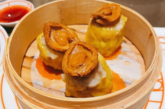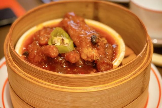 黄金酥虾球,樱花虾金银蒜蒸茄子,酱香金钱肚,笋尖鲜虾饺,豉汁蒸凤爪,脆皮烧腩仔,鲍鱼菠菜苗烧卖,水蟹粥,燕窝