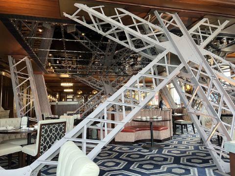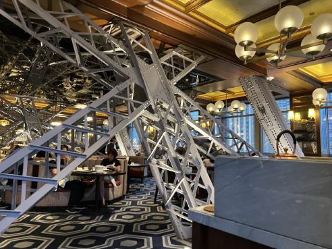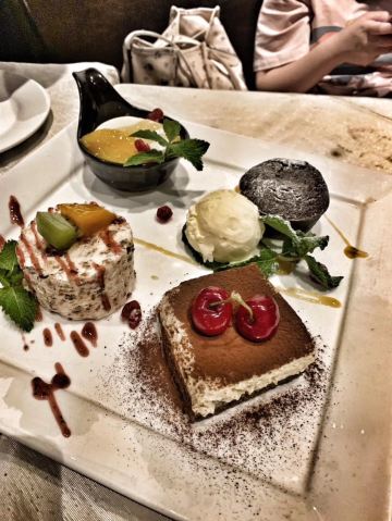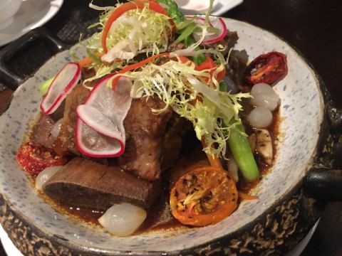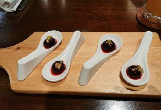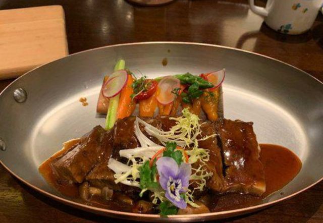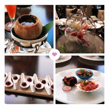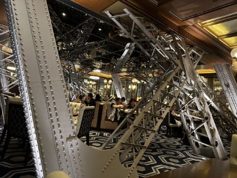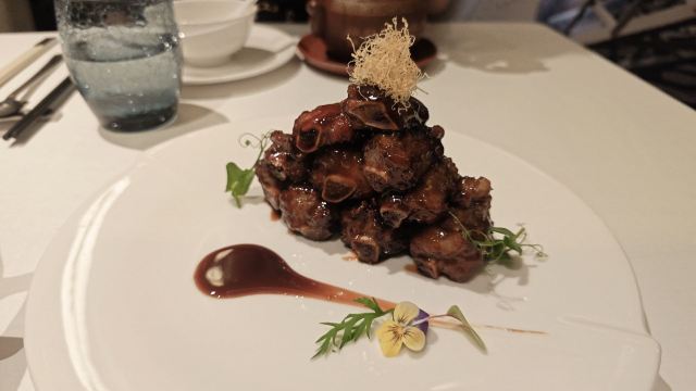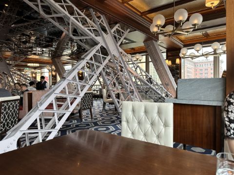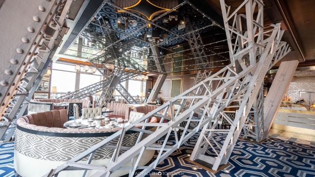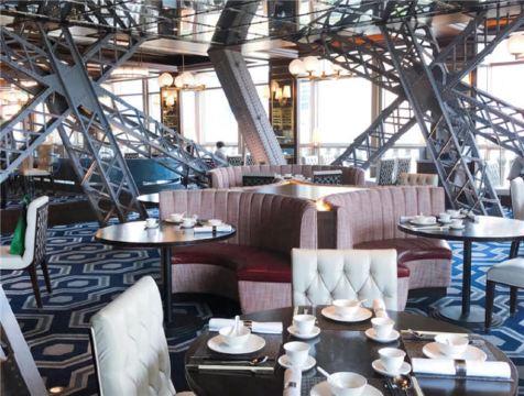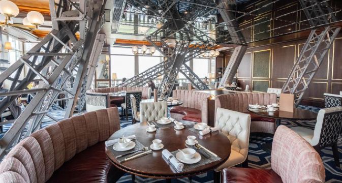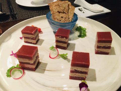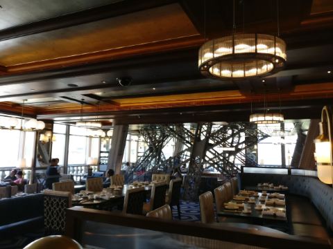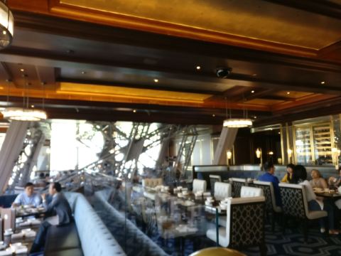 sAviOr_07开在澳门巴黎铁塔里的巴黎轩,提前一天现场来订了景观位晚餐,订座时提醒女士不可以穿拖鞋.....目前因为换了主厨,菜品大变动了。 预约时间到达还需要等待会的,百分之十服务费,服务还可以。 饮料选了粉色的艾菲尔在爱中,冰块多了点 山楂鹅肝冻,一层山楂一层鹅肝的小块,山楂太多了,酸过头了。金牌炸子鸡,烟熏香茅bb鸽,10小时慢煮红烧牛肋骨,这三道都好吃哒。 风车芥兰干葱榄角炒虾球,服务员特地介绍这道菜里面芥兰是厨师亲手雕刻的,于是点了,上菜来一看,汗呀,这个芥兰就是像划香肠一样划了几刀,这个这个我也会哒,炒虾球一般般,味道不行。其他还点了手工蛋白杏仁茶配脆皮杏仁饼。