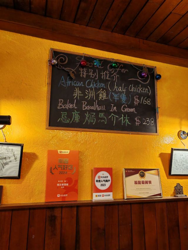 首本名菜有福龙葡式烧乳猪、葡国烧鸭饭、咖喱蟹等,是品尝地道澳门葡国菜选择