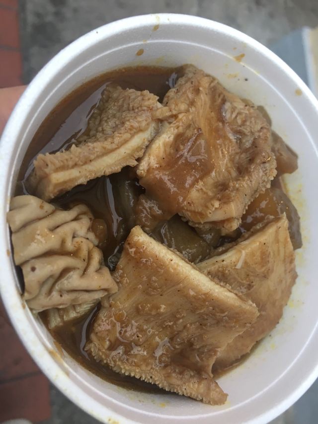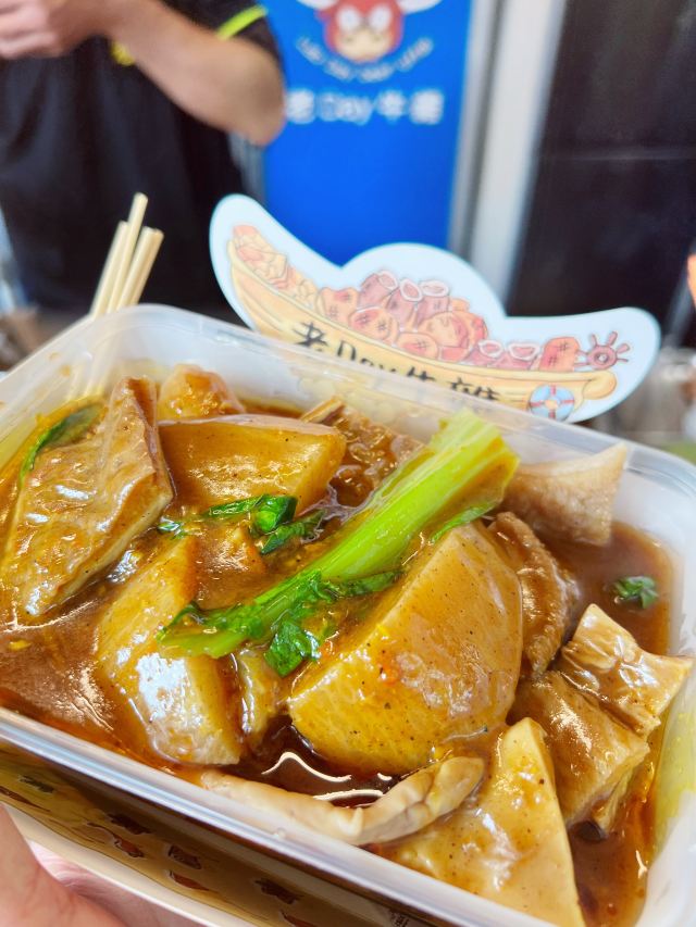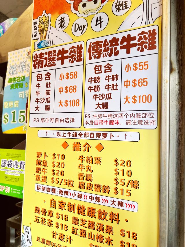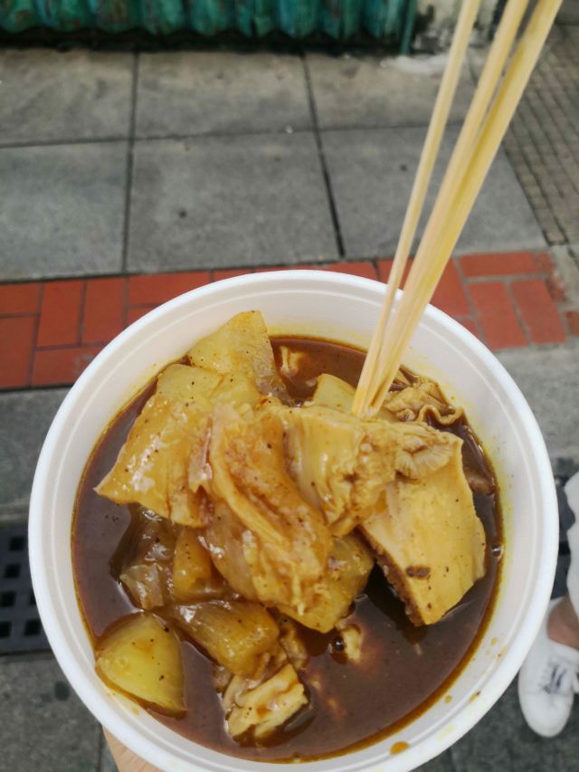 【服务】 牛杂分为精选和传统,老板说传统多了牛肺和牛旁会有腥气味,所以选了精选,中份分量十足,够两个人吃了 【口味】 他家主打的咖喱味,牛杂处理的十分软烂没有异味,也可以加各种配菜,加热后浇上浓郁的酱汁,我选的中辣,香辣入味,个人最喜欢的🇲🇴小吃