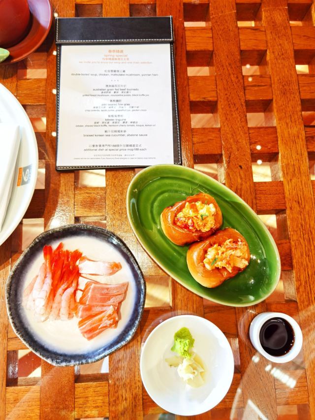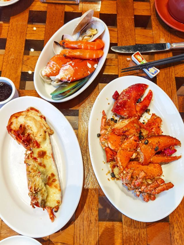 魔女锦鲤美食攻略: 精选菜单:每位顾客首先可以点一份精选炖汤和主菜,餐单随时变化,点了一份鲍汁扣韩国刺参,汤是松茸云腿炖土鸡。如果需要另外加购精选菜式,需要188MOP一个,但来这里主要是吃自助餐的,就没必要额外消费了。 主食:龙虾专区、海鲜专区、蔬菜专区都是先选好食材,再选煮法。即点即煮,只需报上桌号等待服务生送上餐桌即可。 龙虾专区:龙虾是这里最出名的,我们也是为了实现龙虾自由而来。可惜这里的龙虾是波龙不是澳龙,但味道一样好吃,有蒜蓉、避風塘、碳烤、姜蔥炒、芝士焗等多种做法。每样做法先各品尝一种,觉得哪种好吃再加单,无限量供应。活的波龙现杀现烧,肉质弹牙。如果你胃口大的可以提前多点几份,等待需要时间。吃几份也就回本了。 海鲜专区:海鲜类的品种众多,虾、蟹、鲍鱼、老虎斑、贝类等等任君选择。烹饪方法也有很多:清蒸、白灼、豉汁蒸、香煎、蒜蓉蒸、避风塘、豉椒炒、黑椒炒、姜葱炒、椒盐、美极等等。 中餐区、日料刺身区、甜品区:看中哪款自取即可,超级推荐龙虾汤和龙虾包非常好吃。甜品推荐椰子焦糖布丁。果汁推荐鲜榨橙汁和新鲜的龙眼汁都好好喝。