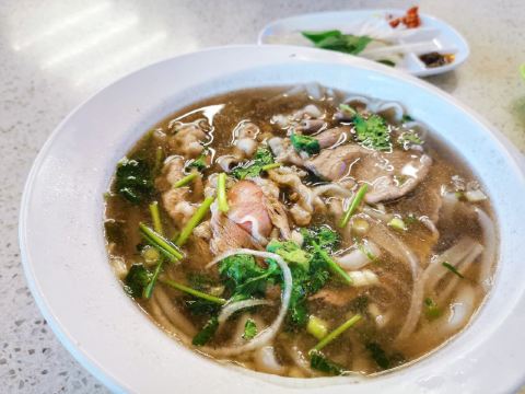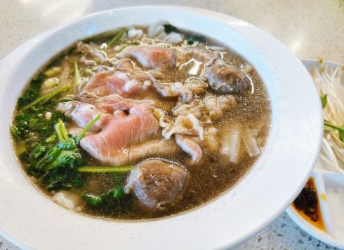 越式汤河粉小店,汤底鲜美,河粉爽滑,牛肉大块鲜嫩,配料丰富,包括牛筋、牛丸、牛百叶等,搭配小菜和辣油,相当不错,推荐招牌火车头河粉。