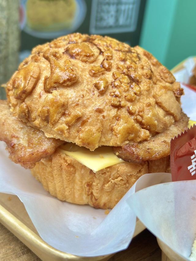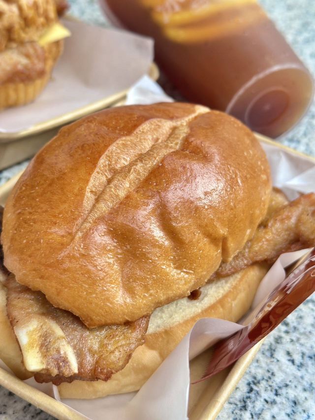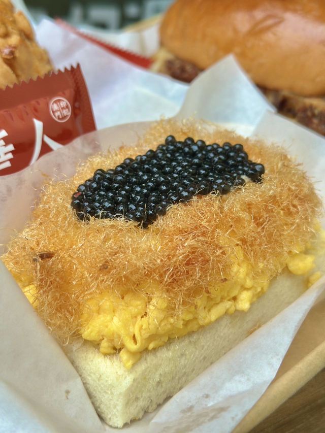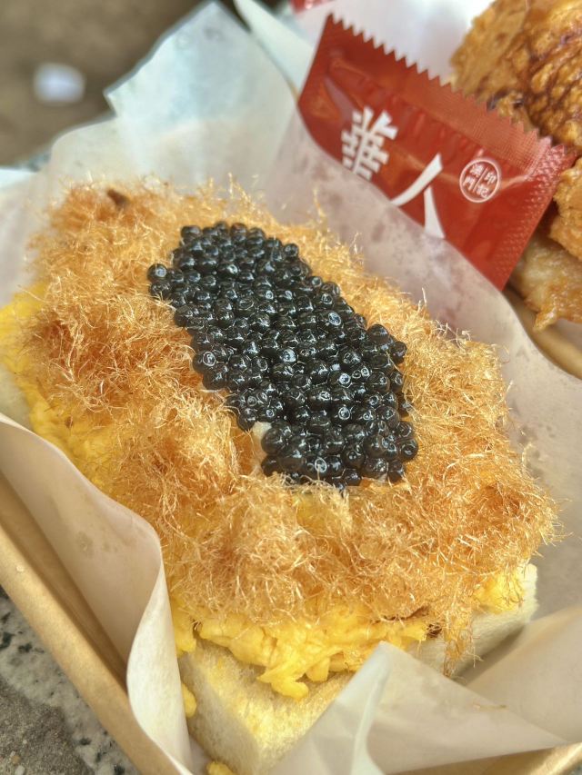 除了奶茶,这儿还有我爱的猪扒包和炒蛋多士 👉鱼子酱马介休炒蛋多士 炒蛋宗师这个美誉真的不是吹的!尊嘟也太足料了,炒蛋厚厚一层叠着一起,上面就是金黄松脆的马介休和爆浆鱼子酱,夹着面包一起吃真的太满足😌一口下去三重美味一次过体验 👉猪扒包 这个包真的666,面积快比得上我的脸了,外脆内嫩的口感简直是乐开了花,而且这块猪扒肉比面包块还要大呢,带骨的猪扒肉鲜嫩多汁,一点都不干,真的太好吃了啦💯! - 和朋友想要体验性价比的搭配👀可以上某评看看哦,都有单人和双人套餐可以选✌️