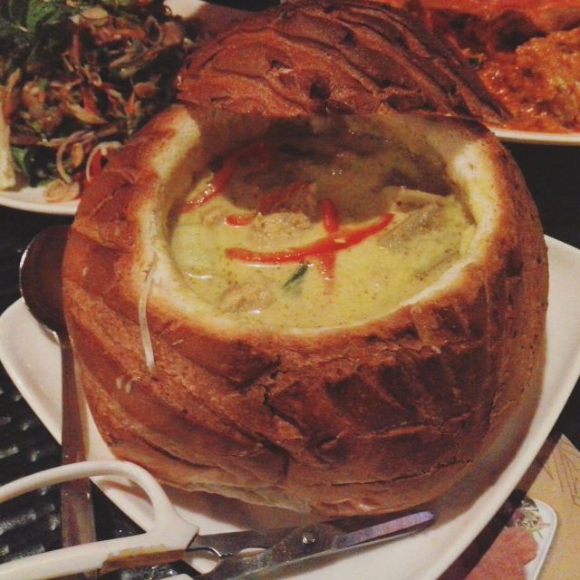烧猪颈肉,咖喱蟹,炒通菜,虾薄饼 ,泰式菠萝炒饭,泰式生虾,冬阴功汤,燒牛肉,椰青椰肉冰,椰青,炸通菜