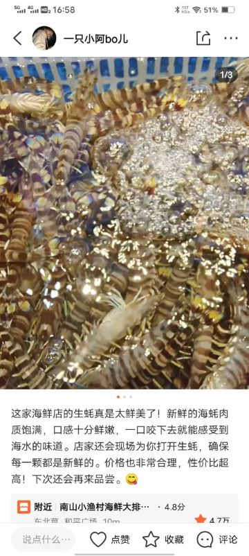 YoYo_4A0U4Y5V南山小渔村海鲜大排档是一家以海鲜美食为主打的餐厅,其独特的环境和口味深受广大食客的喜爱。以下是对这家大排档的全面评论。 首先,让我们来谈谈它的地理位置。南山小渔村海鲜大排档的选址可谓是一大亮点。靠近海边,不仅能够提供新鲜的食材,还为食客带来了轻松的海滨氛围。环境上,餐厅的装修风格简洁大方,既不失海鲜餐厅的特色,又给人以温馨舒适的用餐体验。 说到大排档最关键的一环,那就是食材。在这家餐厅中,你完全无需担心食材的新鲜程度。因为靠近海边,餐厅每天都能获取到最新鲜的海鲜。无论是鱼、虾、贝类还是其他海鲜,都保持着最佳的新鲜度。这种新鲜度不仅保证了食材的口感,更使得每一道菜品的味道都达到了极致。 在菜品的种类上,南山小渔村海鲜大排档也是十分丰富。无论是传统的清蒸鱼、红烧鱼头,还是创新的椒盐虾、蒜蓉扇贝等,都展现出极高的烹饪技巧和口感。尤其是其招牌菜品,无论是味道还是摆盘都让人赞不绝口。此外,这家餐厅对于每一道菜品都有着严格的质量把控,让每一位食客都能吃到安心、放心的美食。 再来说说餐厅的服务。服务人员态度热情周到,无论是点餐、上菜还是餐后的清理工作,都做得井井有条。而且,他们对于每一道菜品的制作过程和食材来源都了如指掌,能够为食客提供详细的介绍和建议。这种贴心的服务使得每一位食客都能在这里享受到宾至如归的感觉。 最后,我们来说说价格方面。相对于其他同类型的餐厅,南山小渔村海鲜大排档的价格定位十分合理。虽然其食材新鲜、菜品丰富、服务周到,但价格却并不高昂。这使得更多的食客能够在这里享受到新鲜美味的海鲜大餐。 总的来说,南山小渔村海鲜大排档是一家值得推荐的餐厅。无论是其地理位置、食材新鲜度、菜品种类、服务质量还是价格方面,都表现出色。如果你想要品尝新鲜美味的海鲜大餐,同时享受轻松的海滨氛围和贴心的服务,那么这家餐厅绝对是一个不错的选择。