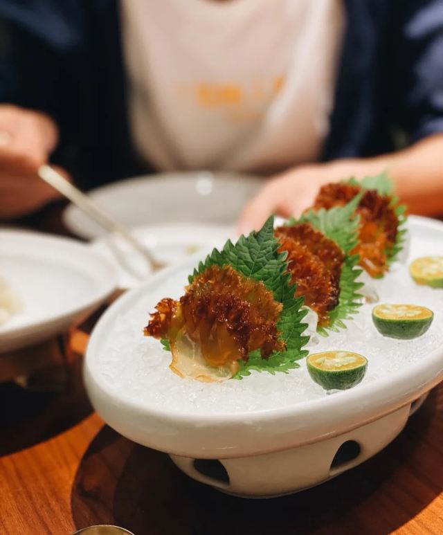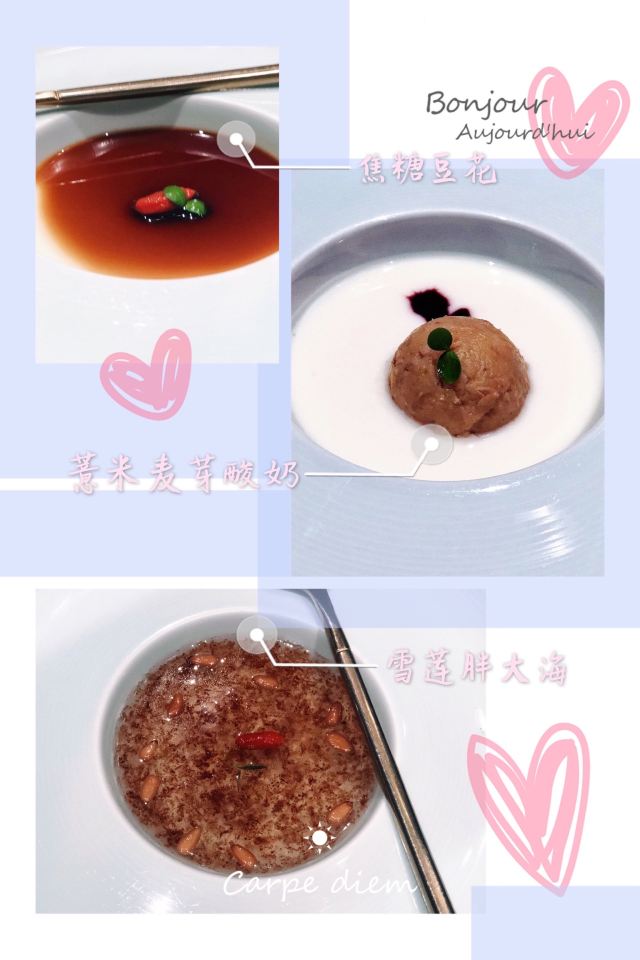 脆炸蛎黄,焦糖豆花,砂锅煨凤爪,腐乳排骨,奇妙虾球,黄瓜鸡蛋虾仁水饺,鲍鱼水饺,原汁海胆饺子,干炸舌头鱼,焖子,蚬子,有机海带鲜肉水饺,特调八宝茶,香炒鸡蛋蟹,咸鱼饼子