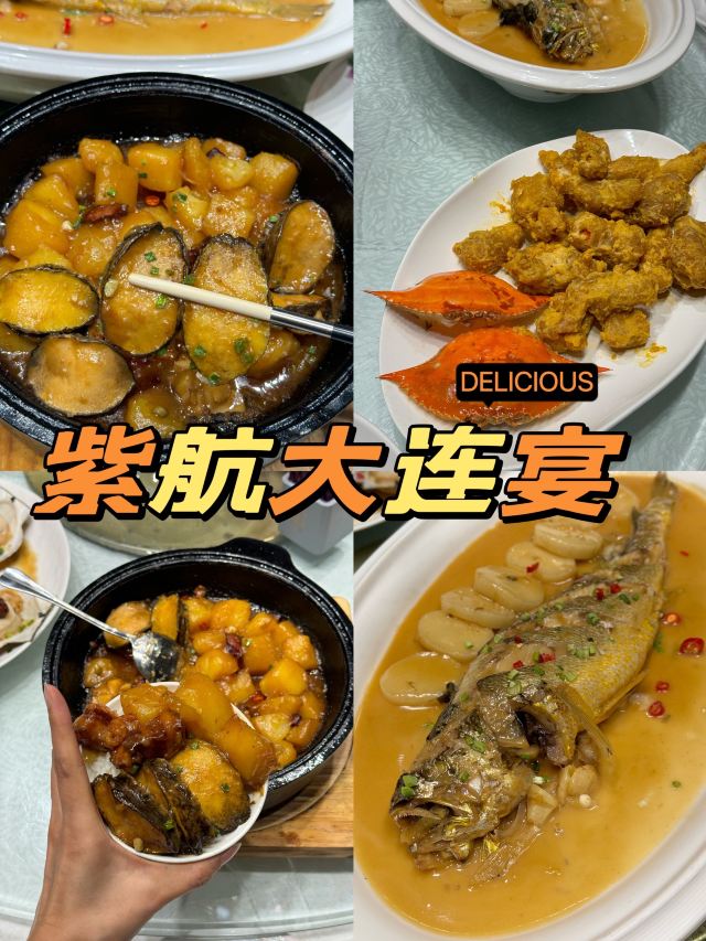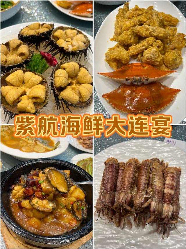 帝王蟹两吃,熏猪手,小平岛黄金海胆,干炸虾仁,紫航特色煎刀鱼,紫航金米海参,海味全家福,大连三鲜焖子,茄子炖海兔,石锅海胆豆腐,生蚝蒜蓉蒸,獐子岛夏夷贝蒜蓉蒸,海螺,海胆,大连鲍鱼