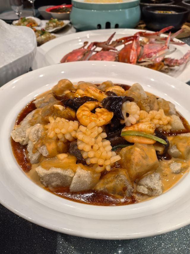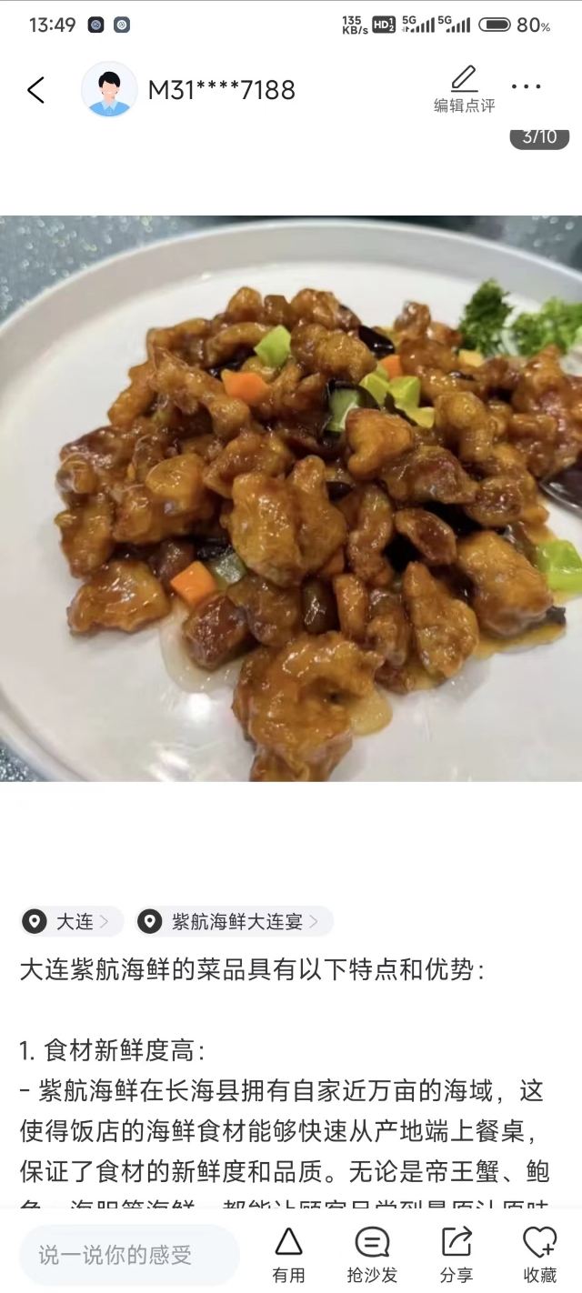 YoYo_6Q7P8X9W大连紫航海鲜的菜品具有以下特点和优势: 1. 食材新鲜度高: - 紫航海鲜在长海县拥有自家近万亩的海域,这使得饭店的海鲜食材能够快速从产地端上餐桌,保证了食材的新鲜度和品质。无论是帝王蟹、鲍鱼、海胆等海鲜,都能让顾客品尝到最原汁原味的鲜美。 - 像小平岛黄金海胆,肉眼可见的新鲜肥美,入口鲜甜,仿佛让人感受到大海的味道;大连的三头鲍肉质紧实,清蒸后保留了其原有的鲜甜,咬起来很有嚼劲。 2. 菜品丰富多样: - 海鲜种类丰富,除了常见的海鲜品种外,还有一些罕见的海鲜可供选择,点菜区犹如一个大型水族馆,满足了不同顾客对于海鲜的需求。 - 烹饪方式多样,融合了多种菜系的做法。既有大连派菜肴的特色做法,又有粤菜、上海菜和鲁菜等风味,比如招牌的帝王蟹两吃,避风塘做法香气扑鼻,外壳酥脆,咸鲜可口;芙蓉蒸的做法则保持了蟹肉的鲜美,香滑软嫩。 3. 招牌菜口味出色: - 帝王蟹两吃:这是紫航海鲜的招牌菜之一,分量十足,两种做法各有千秋。避风塘口味经典,香味浓郁;芙蓉蒸选用渤海湾大对虾和鸡蛋清一起蒸,更加鲜甜,蟹肉厚实饱满,深受顾客喜爱。 - 金米海参粥:选用自家海域的海参配上金米,熬制得十分浓稠,金米的香甜和海参的鲜美相互交织,口感层次丰富,是一道既美味又滋补的菜品。 - 海肠捞饭:海肠的量很多,又鲜又肥美,软嫩 q 弹,鲍汁的调味让米饭更加鲜香,搅拌之后,入口香迷糊了,很多顾客都对这道菜赞不绝口。 4. 其他菜品表现优秀: - 干炸虾仁:虾肉新鲜,个头大,肉质紧致。配有两种口味的蘸料,一种甜酱,一种椒盐,可以满足不同顾客的口味需求。 - 葱炒海蜇头:口感脆爽,酸甜的口味,是一道不错的下饭好菜。 - 砂锅金沙豆腐:豆腐先炸后与蛋黄翻炒,口感层次丰富,每块豆腐都裹满了蛋黄,咸香可口。 5. 菜品分量足:整体来说,紫航海鲜的菜品分量较大,性价比相对较高,适合家庭聚餐、商务宴请等场合。
