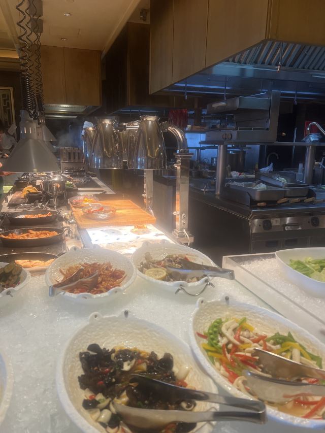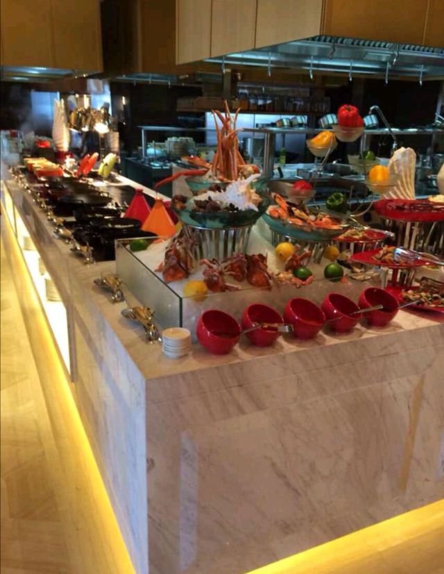 不限量提供中西正餐、西式甜品、地道日料、正宗川味、大连活海鲜料理、东北水饺及兰州手擀面等餐饮品类,全新的零点与自助合而为一体的用餐理念不断刺激客人的味蕾。 全开放式厨房、低温慢煮设备及现场烹饪方式为客人提供地道的环球美食、海鲜料理和大连本地菜肴。