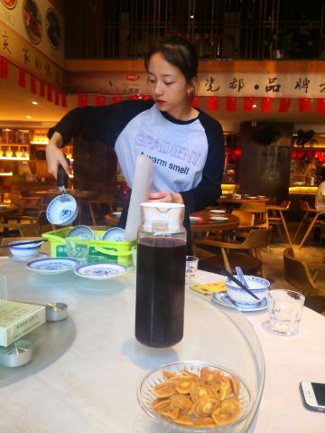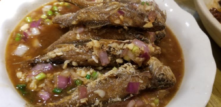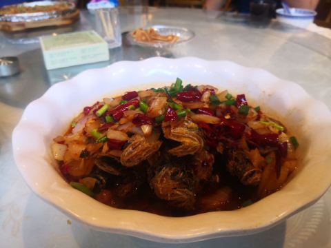景德镇城内,浙江路闹市区,小黄鱼是热门的大牌热门餐厅之一,常年需要排队等位。进门的柜台背后,有一句响亮而有点幽默的口号:千年瓷都,百年老店——我们离百年老店还差八十五年。午间过了饭点高峰,还是有不少食客在等位。招牌的小黄鱼大黄鱼是必点的菜式了,还有些特色的小点心也是不错的补充,可以消解辣菜的冲击。店堂有点局促,但服务还比较到位,价格也公道亲民。