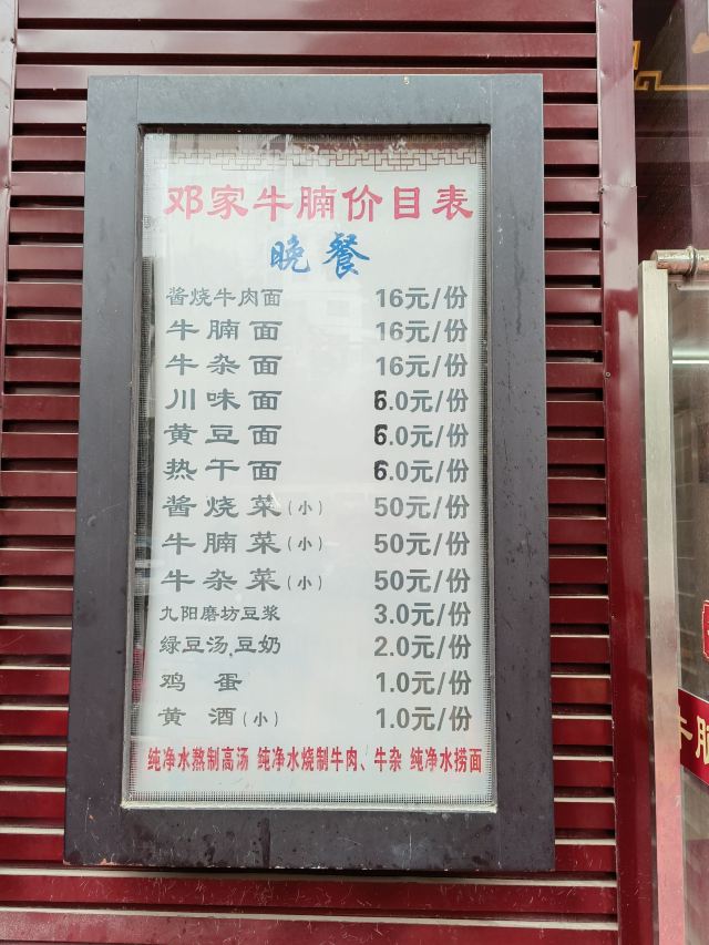 牛腩面,酱烧牛肉面,牛杂面,黄豆面,豆浆,邓家牛肉面,黄酒,豆奶,米酒,邓家牛腩,绿豆汤,川味面,牛五花肉,牛杂,小龙虾