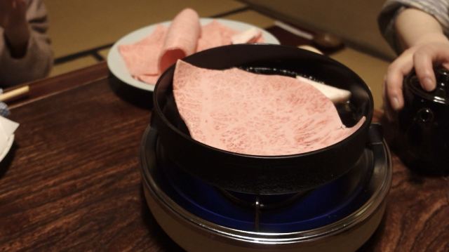 摆渡修行一个小包间,中间一张小桌子,上面摆着铸铁锅。吃完前菜豆腐和天妇罗之后,穿着和服的阿姨端着一大盘子肉走进来。A5近江牛,脂肪分布极其均匀的霜降和牛呈现亮粉色,光看到肉的模样就食欲大开。 热锅涂牛油,倒上一些割下(寿司烧汁),阿姨夹起第一片肉下锅。没想到这肉比锅子还大,我和小伙伴都傻眼了(ΩДΩ)。第一片肉,只蘸蛋液,均匀的脂肪在煎过之后浸入酱油香和少许的甜味,软滑鲜嫩。一整片吃下去也不会觉得腻,大大大满足。 接下来,在寿喜烧汁咕嘟冒泡的时候,下入豆腐,魔芋丝和大葱煎煮。在蔬菜熟透之后下入第二片肉,待肉过火变色,和蔬菜一起盛入碗中。第二碗,在软嫩的肉之上,再填上一份大葱的鲜甜。 第三轮,洋葱,金针菇先行下锅,接着下肉和春菊(类似蒿子秆),食材熟透后盛入碗中。 最后收尾的主食是店家特制杂炊,寿喜烧汁打底,加入米饭淋上蛋液。