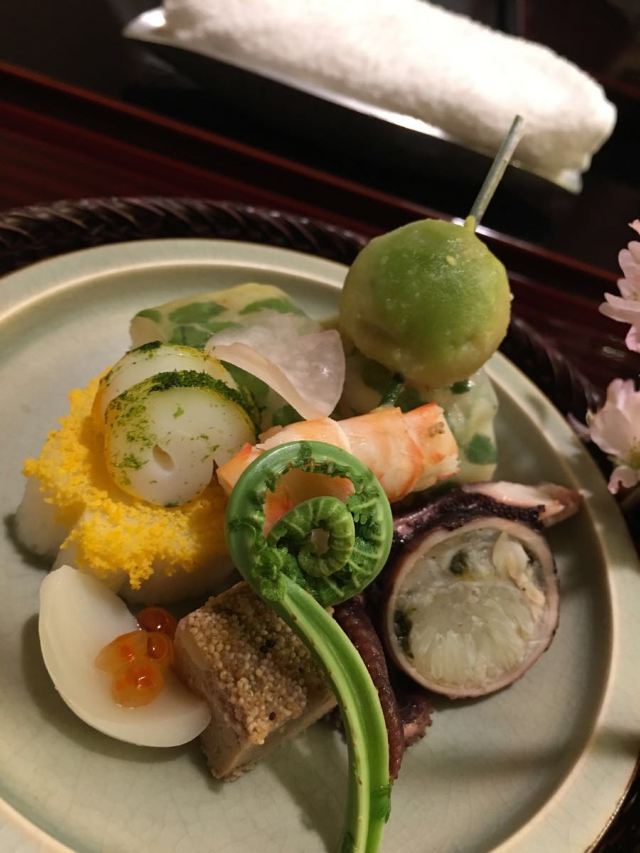 京都著名星级料理菊乃井分店,店内设计也很讲究,进了门有别致的小溪小景观。餐点精致,美味可口。晚市比午市丰盛很多,樱花季的菜品特别美,每道菜都会装点樱花花瓣。