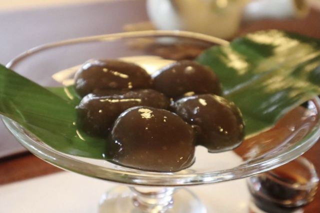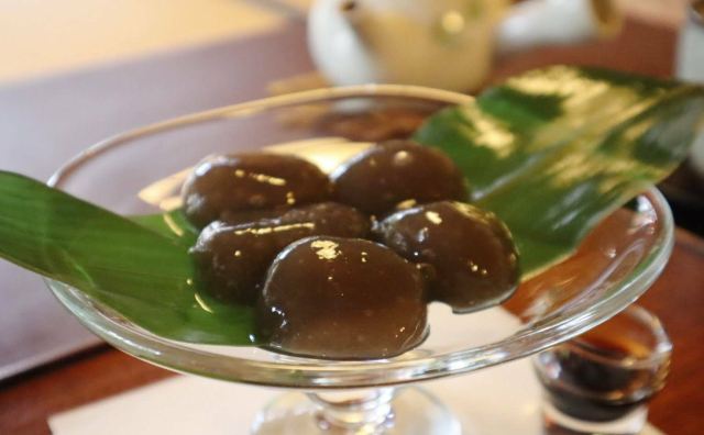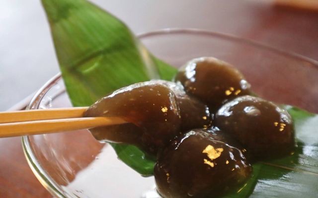京都的茶寮宝泉是人气排队名店,最有名的就是黑本蕨。可坐在和室中一边欣赏庭园、一边吃著和菓子套餐。推荐季节的生菓子(四季不同,每季节有5-6种口味)和抹茶套餐,每份日币950元。可以在店内享用套餐,也可单点外带,外带每个售价日币345元。