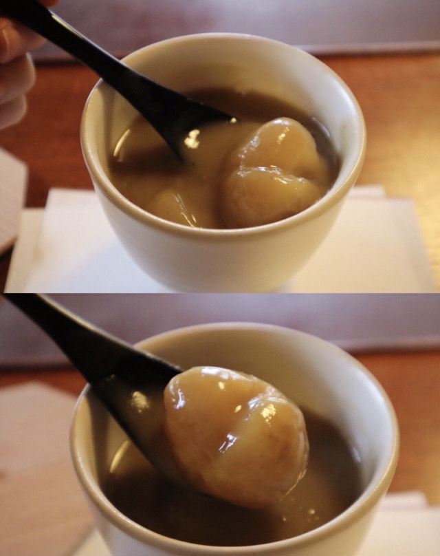 喝着热茶吃着黑豆点心,身心舒畅,坐席位置宽敞,正对庭院,撑着下巴又看呆了。 我点了份わらび餅,身旁的わらび餅死忠粉点了份栗しるこ(?)。 わらび餅 在东京(包括很多其他地方)的わらび餅大多都是裹了黄豆粉切好的,而宝泉的躺在玻璃台上深褐色半透明亮晶晶的五颗小团子,配着黑糖液一起端上来。 空口先吃一颗,刚入口甜味微弱,滑溜弹弹的能稍微拉长。嚼起来弹软,可以用嘴唇轻易压断,越嚼越甜,能在嘴里慢慢化开。 蕨的味道大约是其他わらび餅的五倍,其他わらび餅在宝泉的衬托下就是些个透明果冻。黑糖液稍微有一点就够了,太多了吃到后面好甜。 但是1300円五颗,我觉得其中一半的钱大概是付的院子维护费。 栗しるこ 就是细腻的栗子羹,但只用了京都最高级的丹波栗和糖。 栗子蒸熟后反复磨成细粉再熬煮,里头的大颗丹波栗,浓不甜口感很粉。栗子泥羹像奶油浓汤一样丝滑细腻,温热微甜,栗子浓香,吃着这个还要什么蒙布朗! 这个,比わらび餅好吃! 就是分量吧,只装了小茶杯里大半杯,1500円。