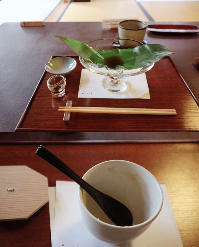 所幸宝泉的院子很大很气派,被照顾得不错,没有去人挤人赏红叶计划的我们,等待期间院子里看饱了。 等到人都呆滞了,终于被请进了里头。 喝着热茶吃着黑豆点心,身心舒畅,坐席位置宽敞,正对庭院,撑着下巴又看呆了。 我点了份わらび餅,身旁的わらび餅死忠粉点了份栗しるこ(?)。 わらび餅 在东京(包括很多其他地方)的わらび餅大多都是裹了黄豆粉切好的,而宝泉的躺在玻璃台上深褐色半透明亮晶晶的五颗小团子,配着黑糖液一起端上来。 空口先吃一颗,刚入口甜味微弱,滑溜弹弹的能稍微拉长。嚼起来弹软,可以用嘴唇轻易压断,越嚼越甜,能在嘴里慢慢化开。 蕨的味道大约是其他わらび餅的五倍,其他わらび餅在宝泉的衬托下就是些个透明果冻。黑糖液稍微有一点就够了,太多了吃到后面好甜。 但是1300円五颗,我觉得其中一半的钱大概是付的院子维护费。 栗しるこ 就是细腻的栗子羹,但只用了京都最高级的丹波栗和糖。 栗子蒸熟后反复磨成细粉再熬煮,里头的大颗丹波栗,浓不甜口感很粉。栗子泥羹像奶油浓汤一样丝滑细腻,温热微甜,栗子浓香,吃着这个还要什么蒙布朗! 这个,比わらび餅好吃! 就是分量吧,只装了小茶杯里大半杯,1500円。 还买了2个和果子打包带走,定价良心,味道口感都不错,还不会过甜。是和果子队伍中“好吃”方阵里的! 宝泉,味道确实好,代价也确实高。