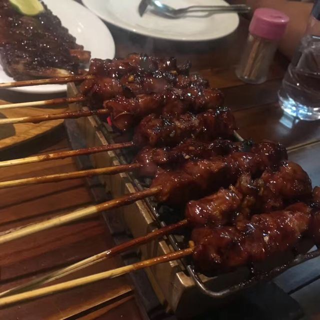 去巴厘岛一定要吃Warung Chef Bagus的烤猪肋排[馋嘴][馋嘴][馋嘴] 现烤的肋排 刷上微微甜辣的浓厚酱汁 烤好的肉肉外焦里嫩 连着骨头的部分带一点点刚好的肥筋 怪不得人那么多,是真的好吃,一份量也很多,根本吃不完