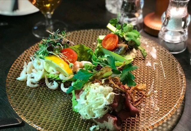 鞑靼牛排,萝卜沙拉,烟熏鳕鱼,烤羊小腿,酥炸洋葱,酥脆猪耳朵