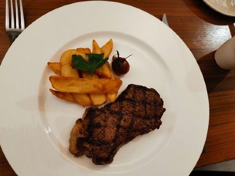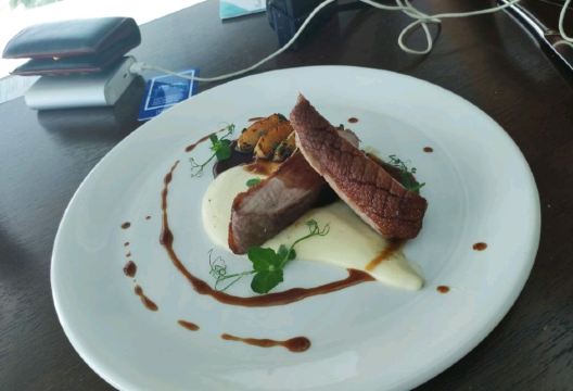 木地板和昏黄的黄色吊灯营造了温暖舒适的用餐环境,餐厅还有房间可供客人举行会议、聚餐,保证了私密性。餐厅供应西餐,大厨经验丰富,每道料理摆盘精致,既养眼又好吃。餐厅的服务员还会根据所点的菜肴推荐相应的红酒。
