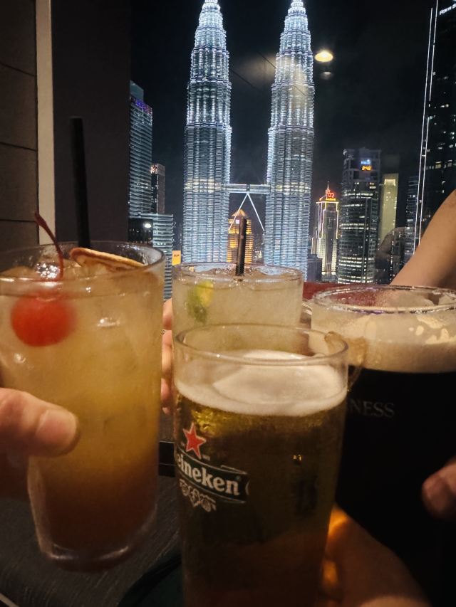 吉隆坡SkyBar位于市中心Traders Hotel顶楼的泳池楼层,拥有绝佳景观,国油双峰塔和脚下的吉隆坡城中城公园一覧无遗,紧贴游泳池旁边的一列靠窗座位最受欢迎,一位难求,在日落前的magic hour到来,可一边品尝美酒,一边欣赏着双峰塔由金黄色夕阳影照到华灯初上的变化,而入夜后的璀璨灯光更迷人,到吉隆坡旅游这是欣赏双峰塔的理想地点。