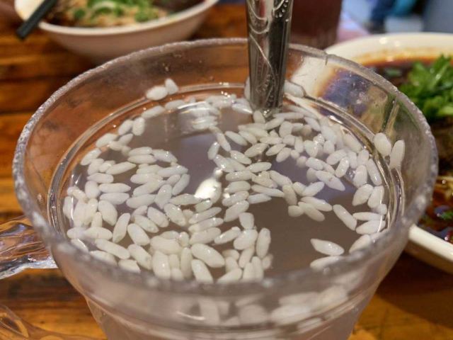 20元一碗的牛肉面配上5元一杯的冰赤豆酒酿,热辣浓郁的牛肉香加上冰镇爽口的酒酿,实在是绝配