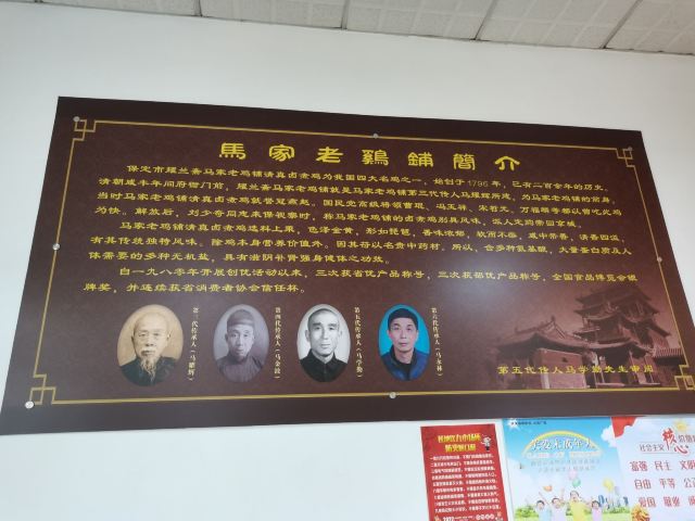 Majialaojipu马家老鸡铺距今已有二百余年历史,一七九六年河北省河间县果子洼村马姓回族人在保定马号真武庙胡同开设了制卖熟鸡的家厨式作坊。清咸丰年间,第三代传人马耀辉在府衙大街南边置买了两间店铺,创建了“耀兰斋马家老鸡铺”,也就是现今马家老鸡铺的前身。据说,清末直隶总督李鸿章在保定时,就对此卤煮鸡赞不绝口。民国时期,国民党高级将领曹锟、冯玉祥、宋哲元、万福麟等都以曾吃过此鸡为快。在一九八一年全国名特风味肉禽蛋制品优质产品评比大会上,马家老鸡铺清真卤煮鸡和浙江金华火腿、苏州五香酱肉等三十三种产品被评为全国优质产品。还有很多不远万里来保定的外地人慕名来此。