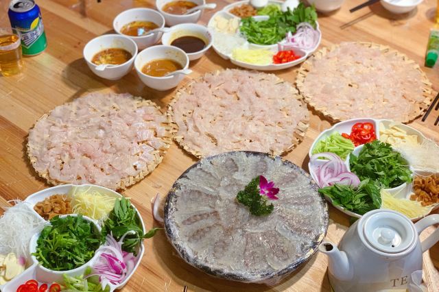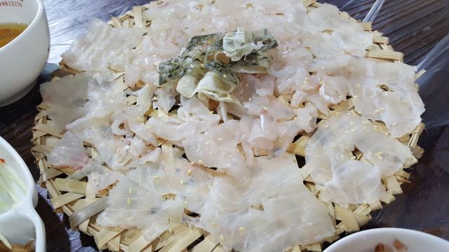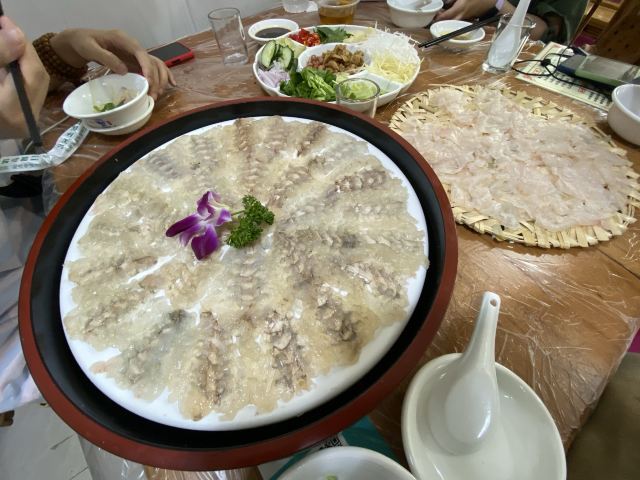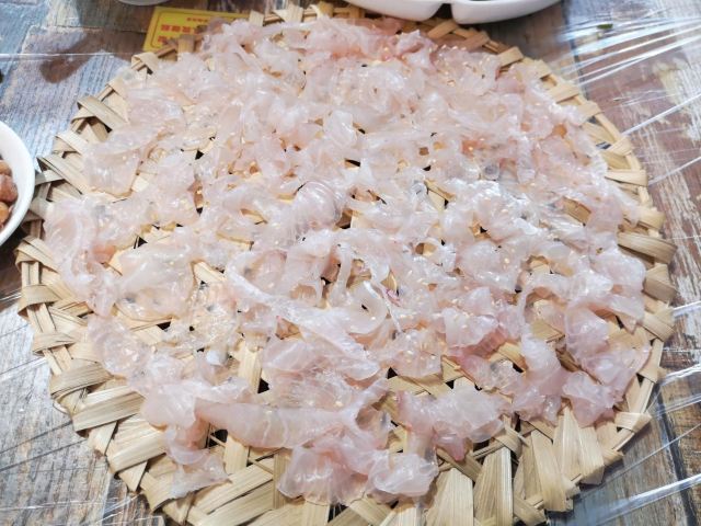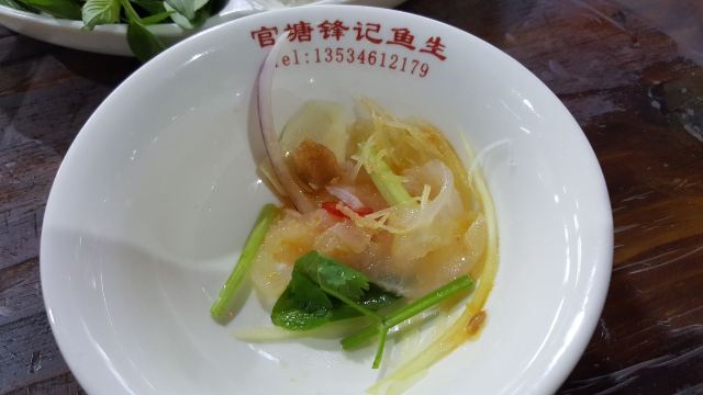 金雕鱼生,虾生,咸膏蟹,凉拌鱼皮,蒜蓉粉丝蒸扇贝,海鲜粥,咸膏蟹,虾生,鱼粥,三文鱼,虾生,咸羔蟹,沙虾,咸膏蟹配酱,萝卜干,膏蟹,野生海虾,盐焗花生