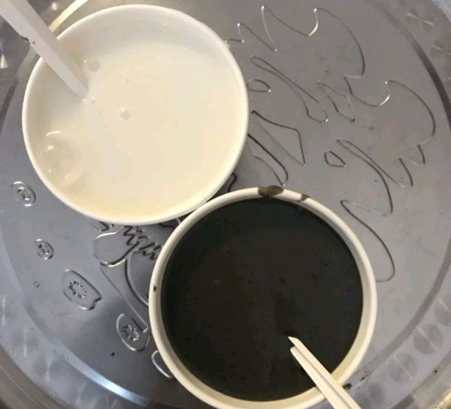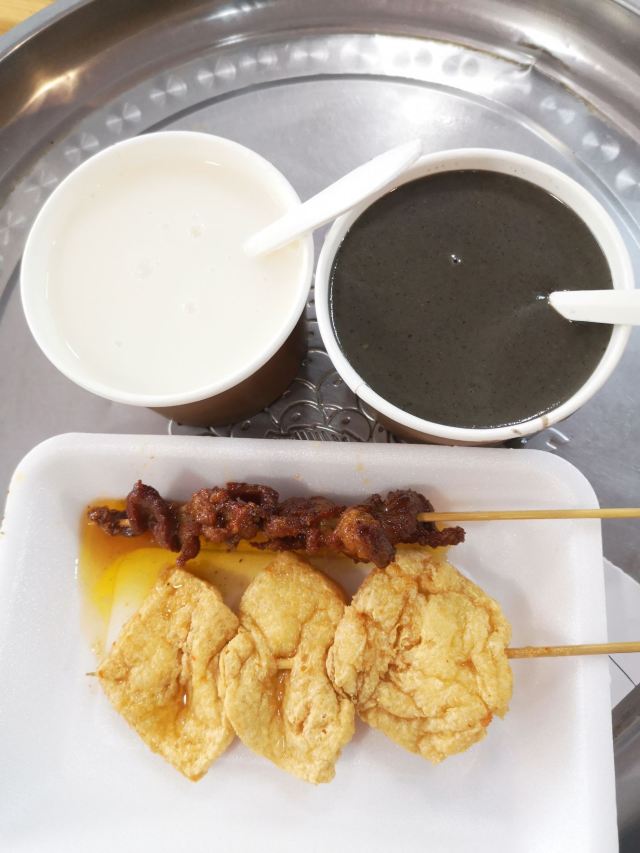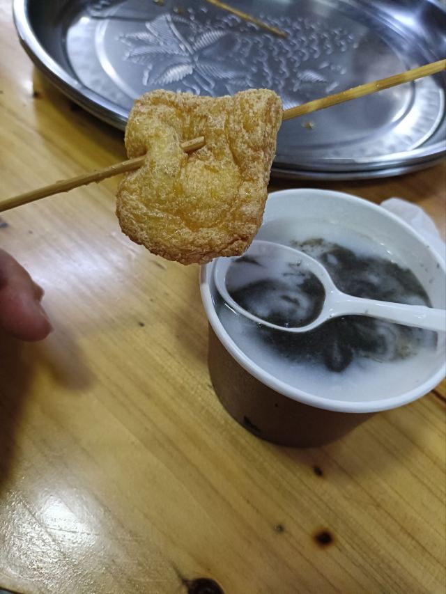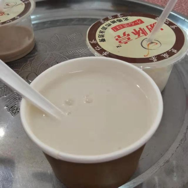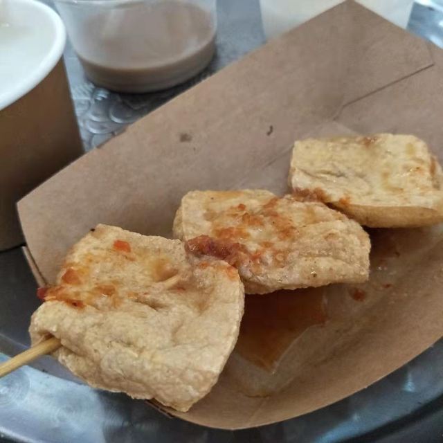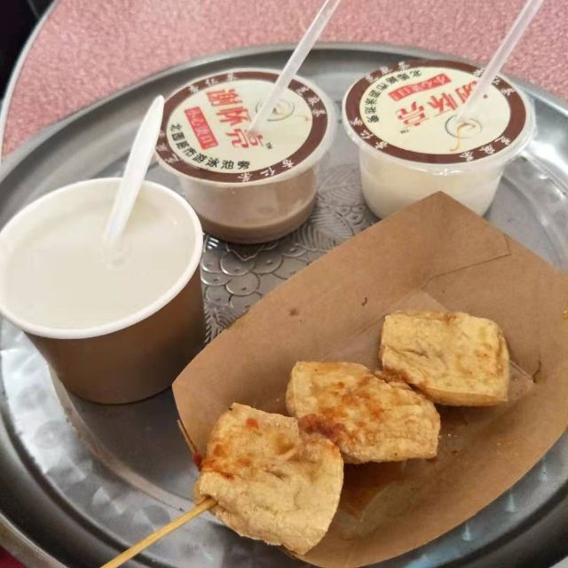 炸豆腐,杏仁茶,黑芝麻茶,白芝麻茶,炸饺子,炸肉串,炸豆干,黑芝麻拼杏仁茶