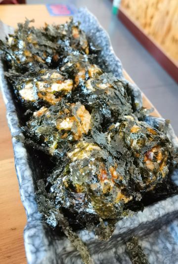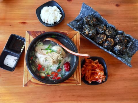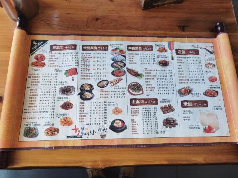 延吉美食的热门餐厅之一,延吉的照牌都是韩文+中午,餐厅也是朝鲜风格的装修,中午就餐的顾客也很多。餐牌的美食有很多,无奈只有两人,食量不大,只能点几样。包饭是必点的,五花肉包饭是最多人推荐的,不爱肥肉,选了另外一款也是比较多人推荐的饭团月牙骨,一碟包饭就有8个,两个人绝对吃不完,饭团很香,用紫菜包裹,里面有点脆脆的口感。参鸡汤,味道比较淡,可以加盐,但没喝怎么喝出有参味,鸡的内陇还有糯米饭,鸡肉已经炖得很烂。一般般,有点失望。虾仁油麦菜,妈妈要吃青菜,随便点的。
