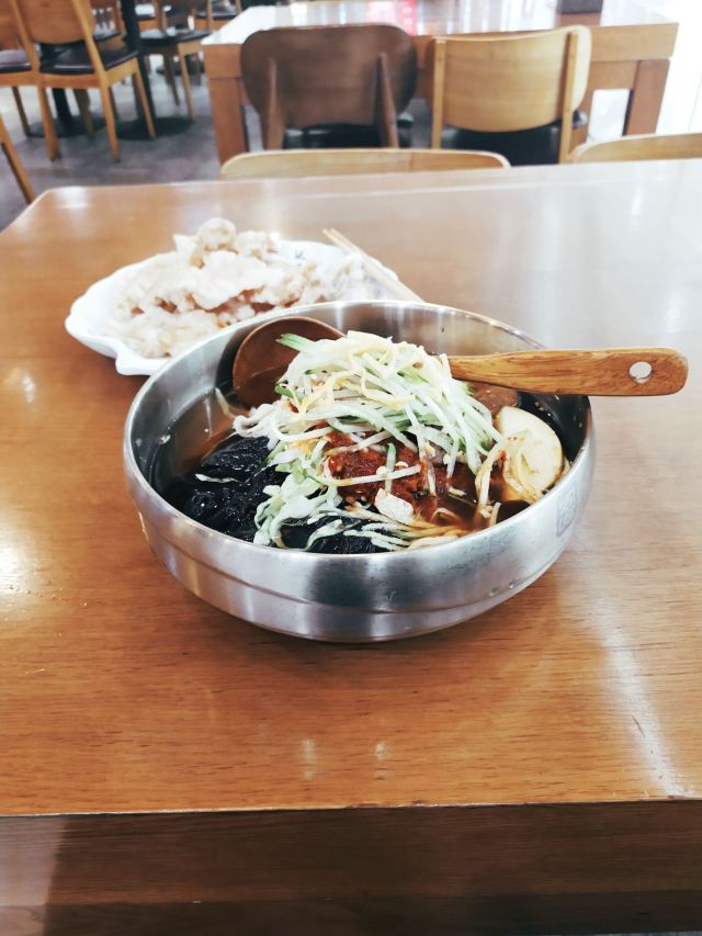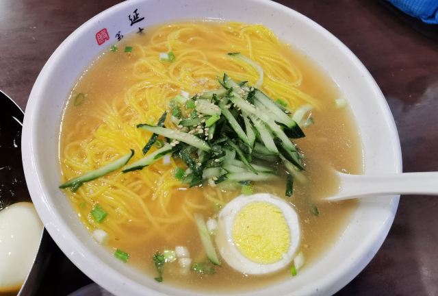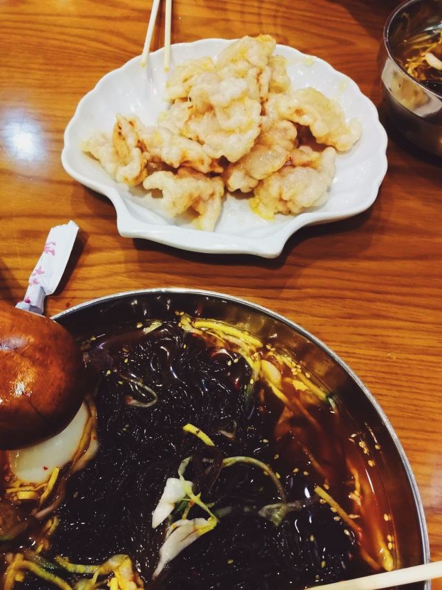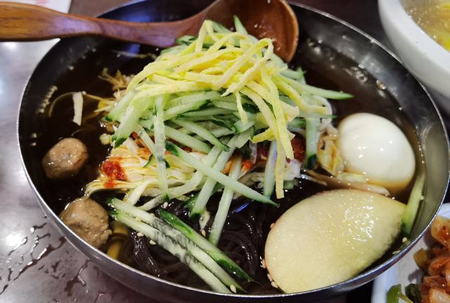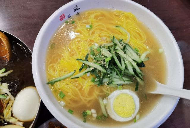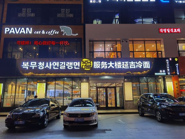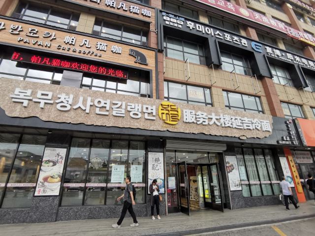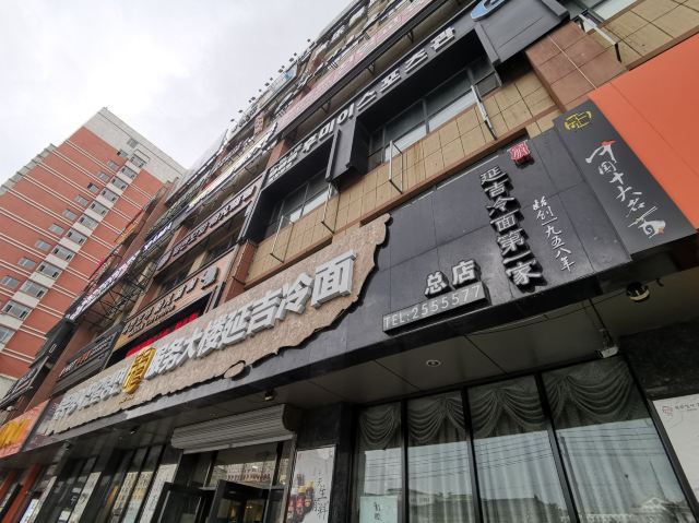 服务大楼延吉冷面:延边大学附近也有很多美食,喜欢吃冷面的同学不可错过学校正门对面的服务大楼冷面。这里是延吉的第一家冷面,老字号。晚上8点就关门了,一定要早点过来。冷面是朝鲜族传统食物,使用荞麦面或小麦面制成。朝鲜族有正月初四中午或者过生日时吃冷面的传统,据民间传说,这一天吃了纤细绵长的冷面就会预兆多福多寿,长命百岁,故冷面又叫:长寿面。冷面是必点的,如果不想吃冷的也可以点温面,味道也是不错的。特技冷面是加了很多丰富的配料,价格是普通冷面的一倍,建议点普通冷面即可,份量也很大,面条爽口Q弹,冰冰冷的好好吃。玉米温面也同样Q弹,好吃。